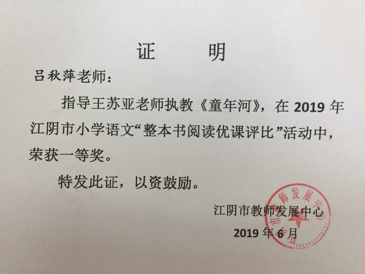 吕秋萍老师指导王苏亚老师执教的《童年河》获江阴市一等奖