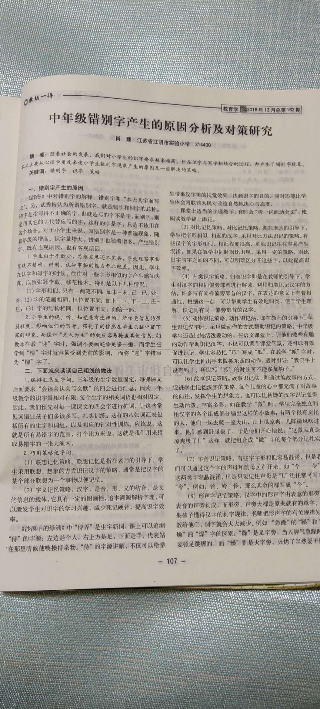 肖斓老师《中年级错别字产生的原因分析及对策研究》发表于教育学