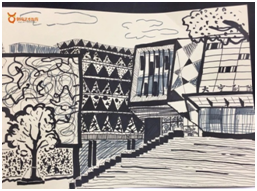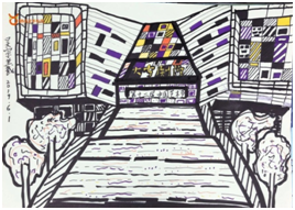 接下来,是我们最近一期组织学生进行的街景写生:都市建筑风格以简约风格为主,水泥、钢筋、玻璃⋯⋯多以直线方块构成,我们大人看到的多数是冷冰冰的建筑,如果大人去画,极可能只能得到雷同的"建筑效果图"而孩子们面对同一场景,却总能发现不一样的美与趣味,每个人根据自己的特点创作出了自己的"技法",还可以选择自己喜欢的观察方式、角度、距离、重点再使用单元课的递进方法,不急于求成,