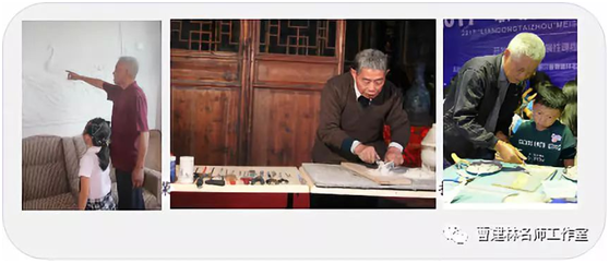随着时代的发展和建筑材料的更新,灰雕这一传统建筑工艺也日渐衰退。懂灰雕工艺或愿意学习这项技能的人已经寥寥无几。当地的最后几位灰雕传承人都已年过花甲。而路桥灰雕的密码正蕴藏在这些民间艺人身上。为了引发学生对于灰雕的深度学习,引领其走近艺人。我们在上《灰雕老艺人》这课时,进行了互动的专题观赏。教师带着孩子们有目的地探访了当地的灰雕传承人,参观其灰雕工作室;或邀请老艺人进课堂现场传授(见图9、图10),邀请老艺人走进课堂现场传授(见图11)。当然,艺人授课的课堂应注意方方面面,要注重课堂实效,应当提前与灰雕艺人衔接好传授与讲解的内容,教师就像主持人一样调控着课堂的节奏,并事先准备一些艺人的作品进行展示,激发学生对灰雕工艺进一步探究的热情。然后,向学生介绍灰雕艺人的一些成就和事迹,激发学生的崇拜之情。灰雕艺人带着自己的工具箱出现在学生面前时,现场的掌声与惊叹声立马将课堂气氛推向高潮。老艺人介绍了灰雕的制作工具、材料,讲授灰雕的制作工序,并做了现场示范。在体验环节,老艺人悉心地指导每一位学生。那严谨的态度与手法无声地影响着在场的师生。学生们也纷纷向老艺人提问:“为什么要在灰雕的主材料蛎灰中加入麻精?”、“台州地处海边,台风较多,为何这些灰雕能百年不倒?”、“这么多表现形式的灰雕,它们的制作工序是否一样?有没有更快捷的制作方法?”“灰雕纹样的设计有什么讲究?” ……这些问题非常有意义,老艺人一一解答。