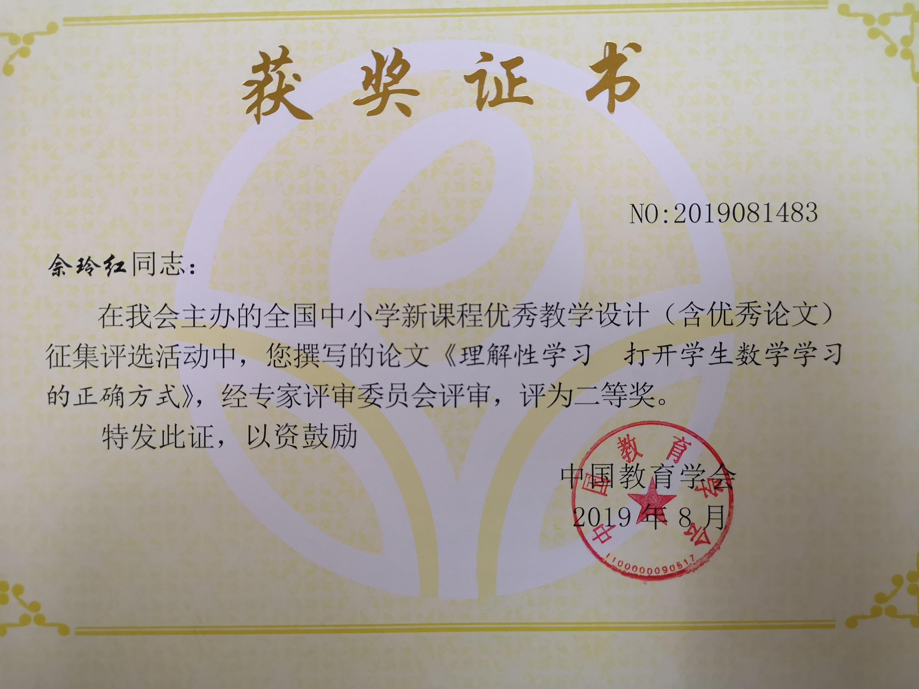 佘玲红老师参加全国中小学新课程优秀教学设计(含优秀论文)征集评选活动荣获二等奖