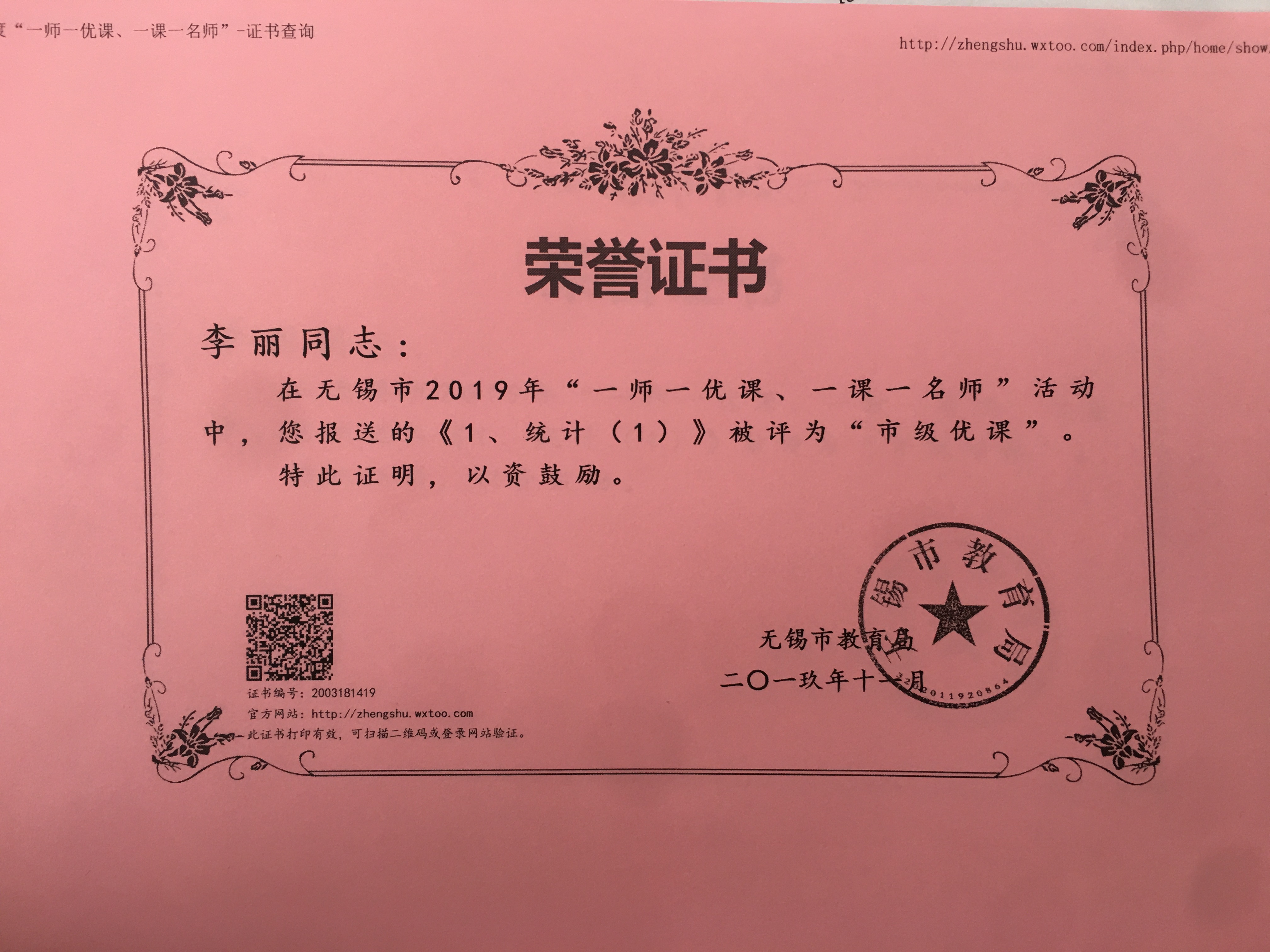 李丽老师的《统计》在无锡市2019年“一师一优课 一课一名师”活动中被评为“市级优课”