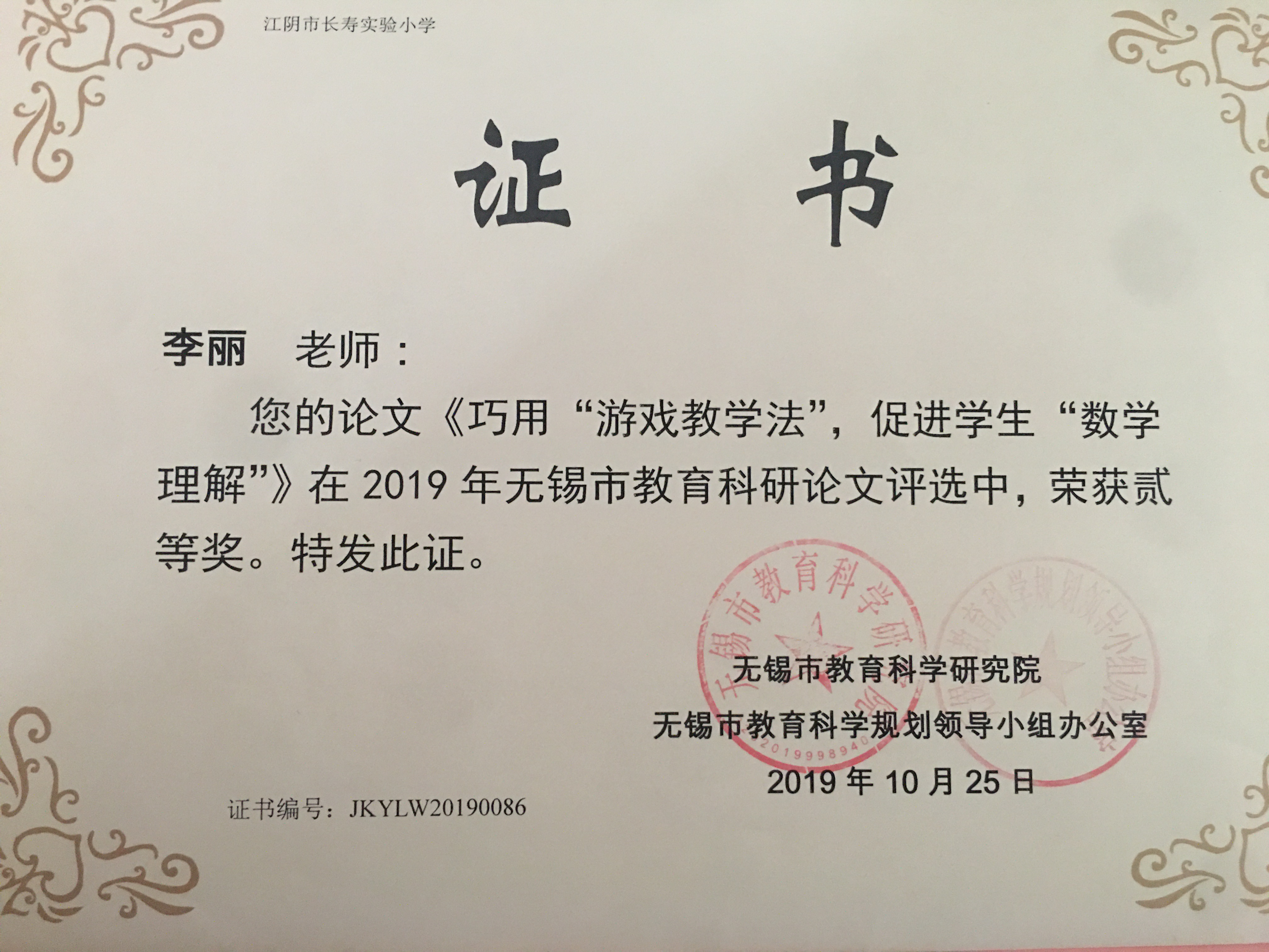李丽老师撰写的论文在2019无锡市教育科研论文评选中荣获二等奖