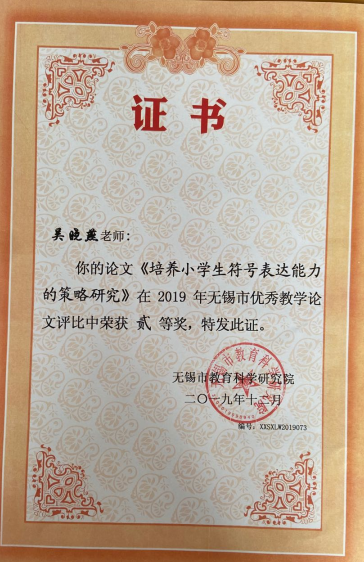 吴晓燕老师参加无锡市优秀教学论文评比获二等奖