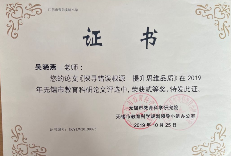 吴晓燕老师参加无锡市教育科研论文评比获二等奖