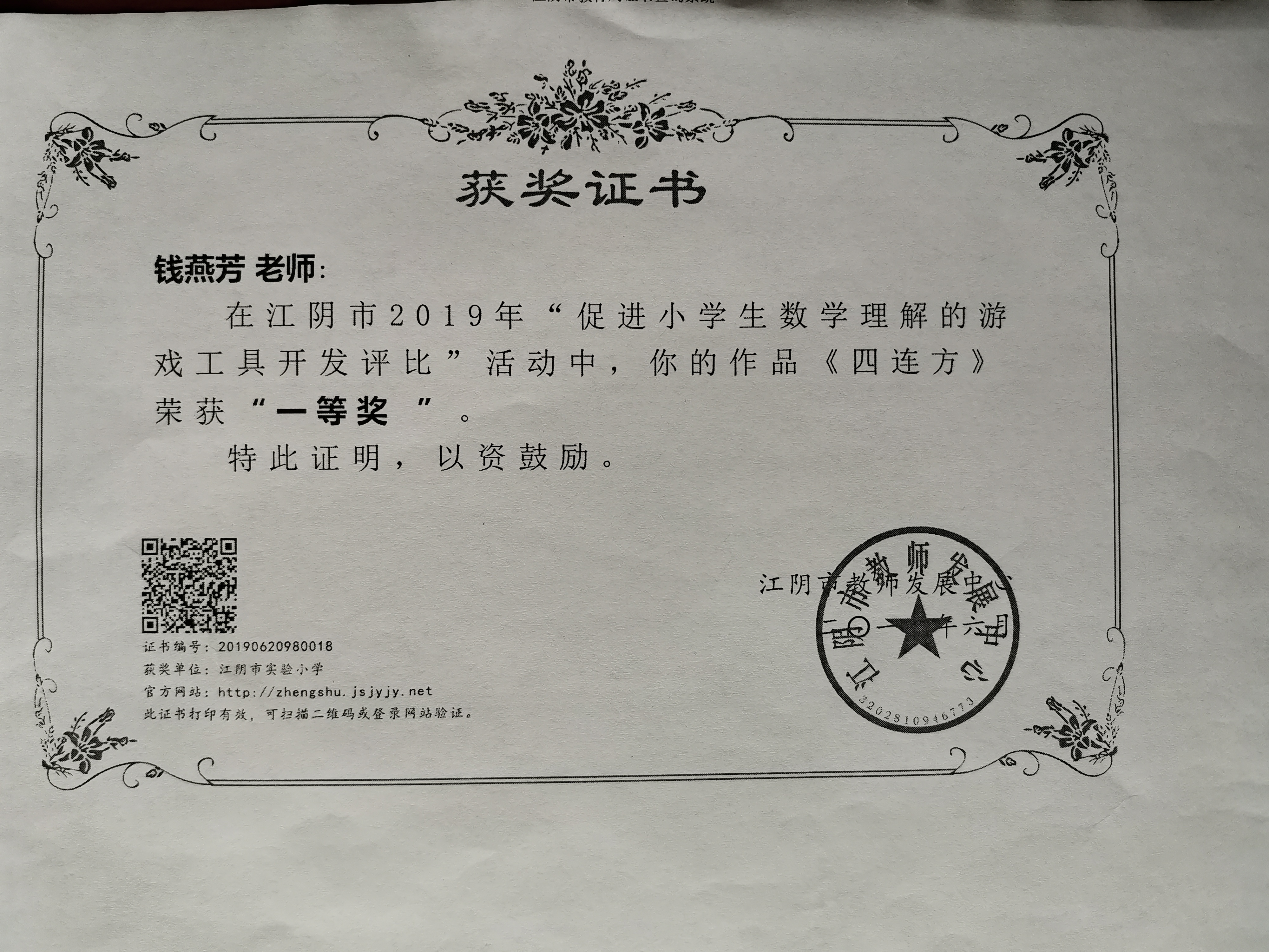 钱燕芳老师在2019年江阴市“促进小学生数学理解的游戏工具开发评比”活动中荣获一等奖