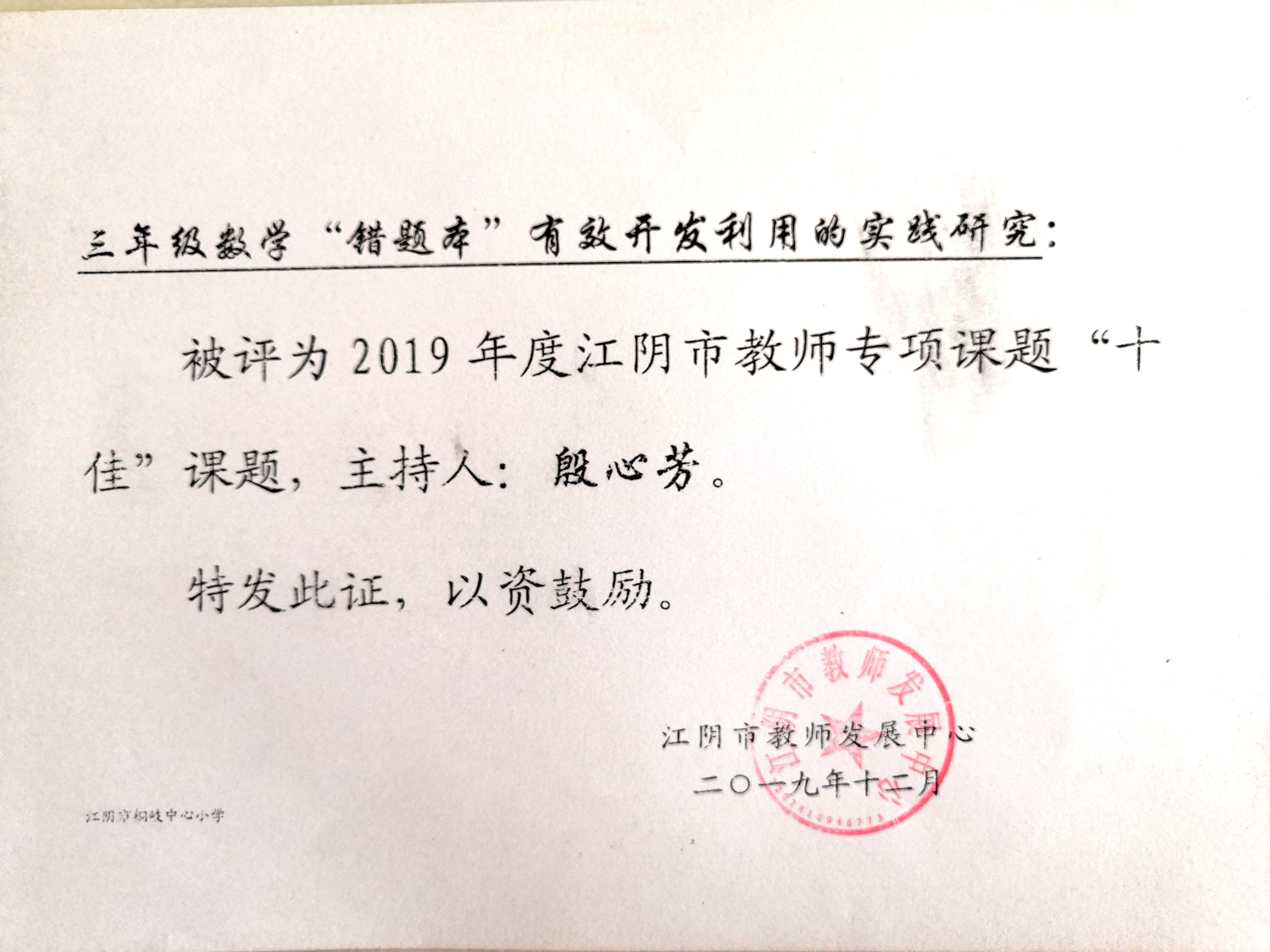 殷心芳老师主持的课题,在2019年江阴市教师专项课题评比中,获得“十佳课题”