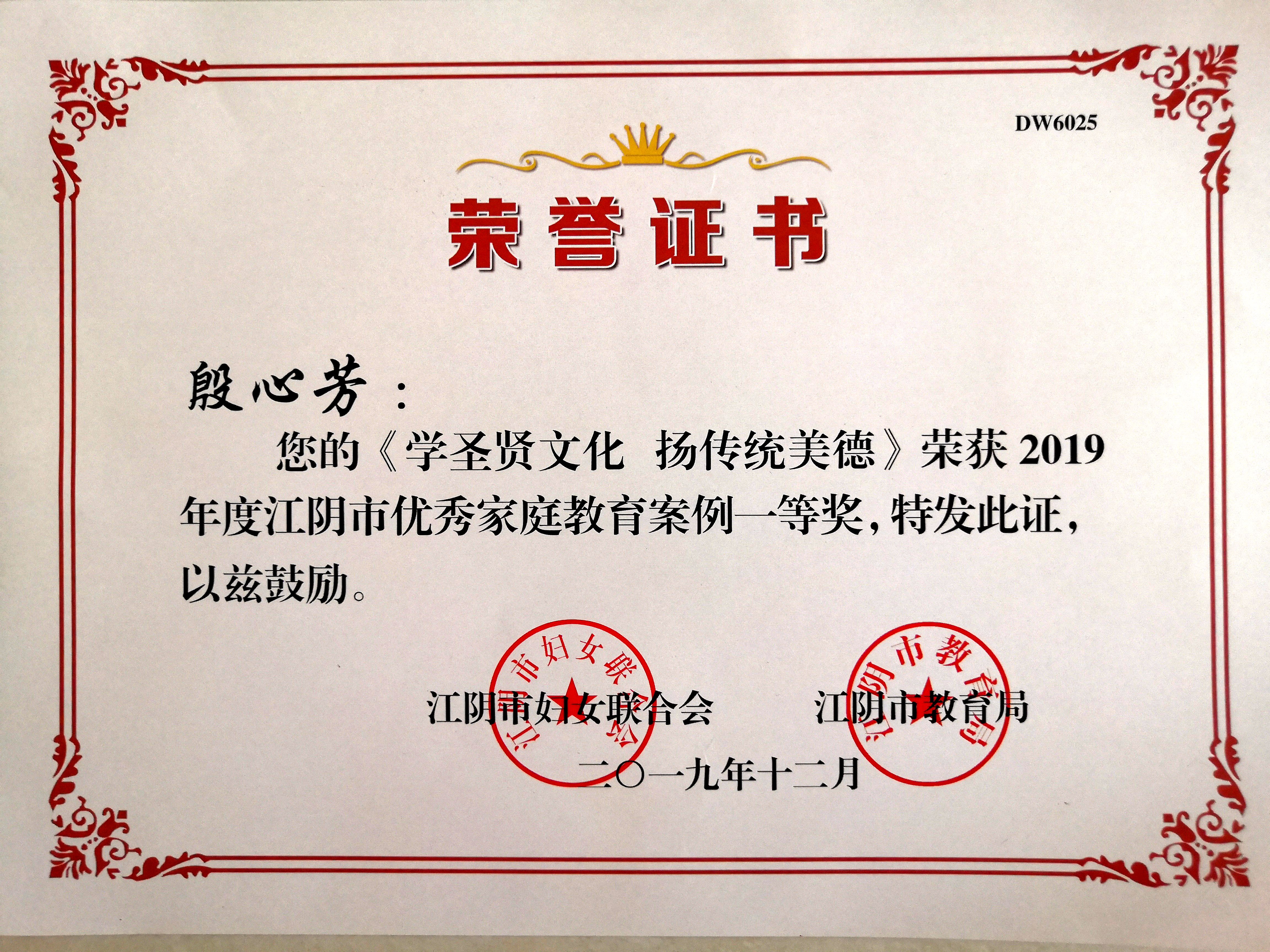 殷心芳老师在2019年度江阴市优秀家庭教育案例评选中,荣获一等奖