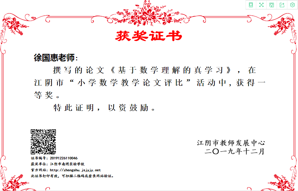 徐国惠老师的论文《基于数学理解的真学习》获评江阴市一等奖