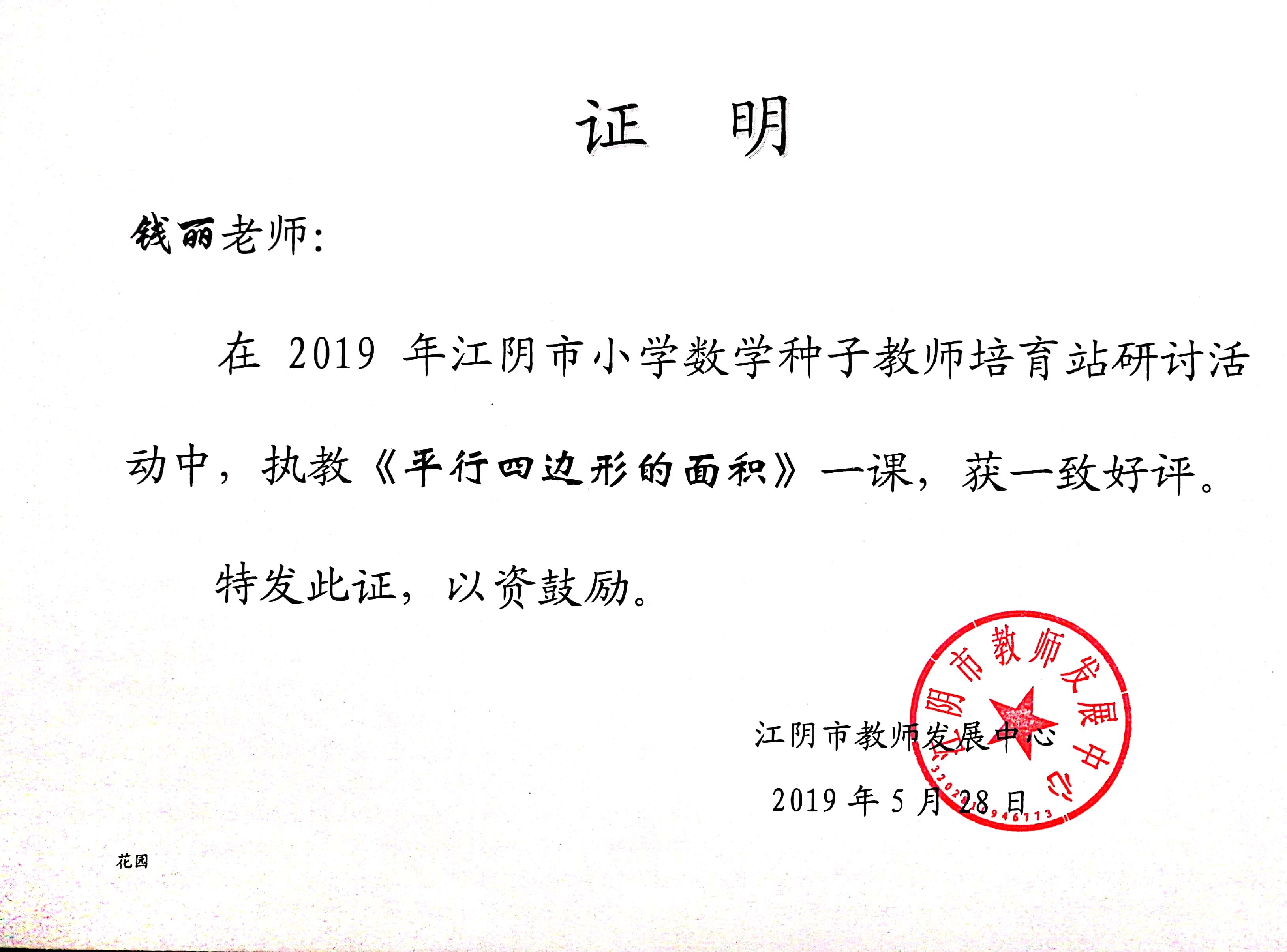 钱丽老师在江阴市小学数学种子教师培育站研讨活动中,执教《平行四边形的面积》一课,获得一致好评!