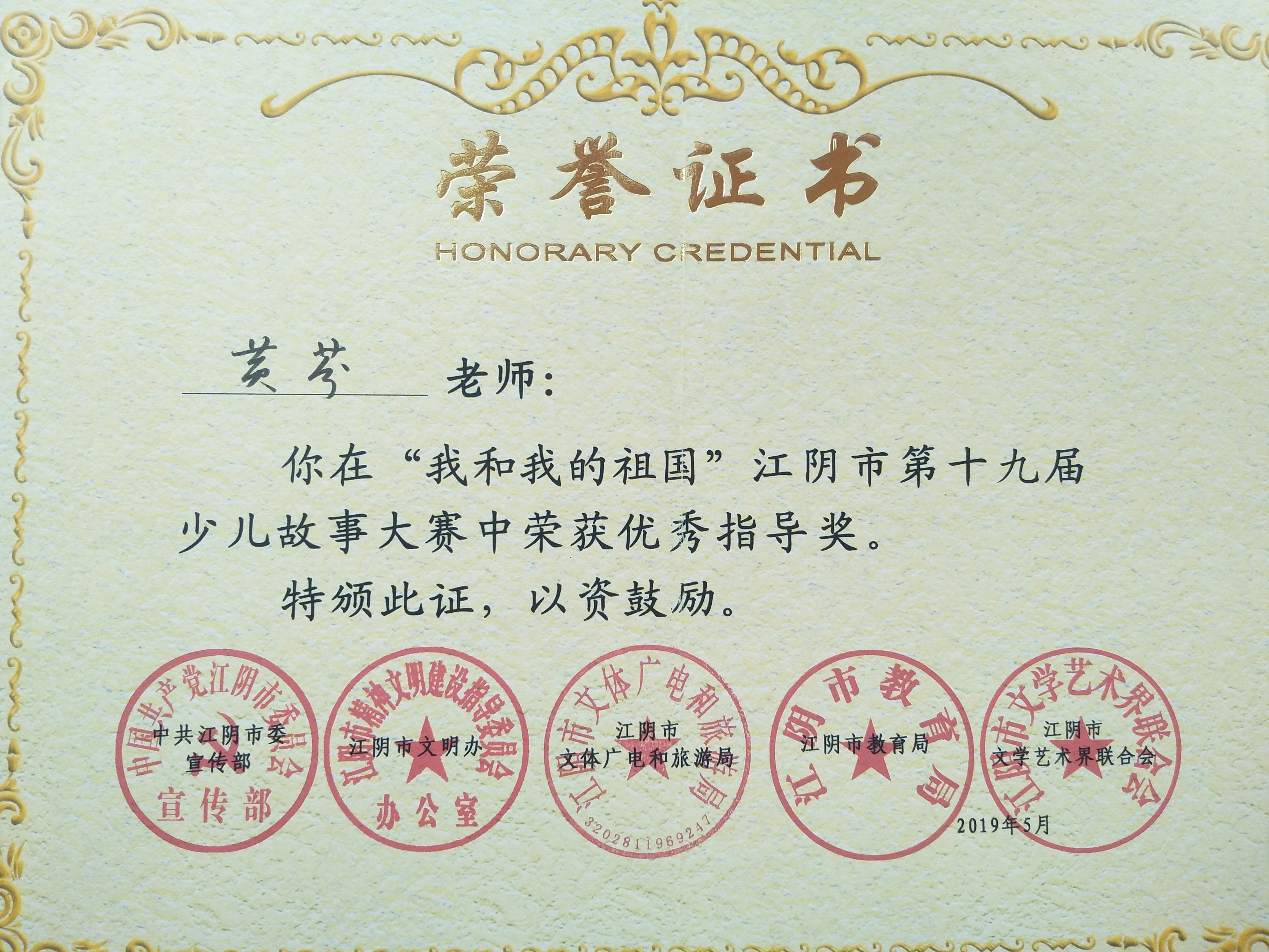 黄芬老师在江阴市第十九届少儿故事大赛中荣获优秀指导奖