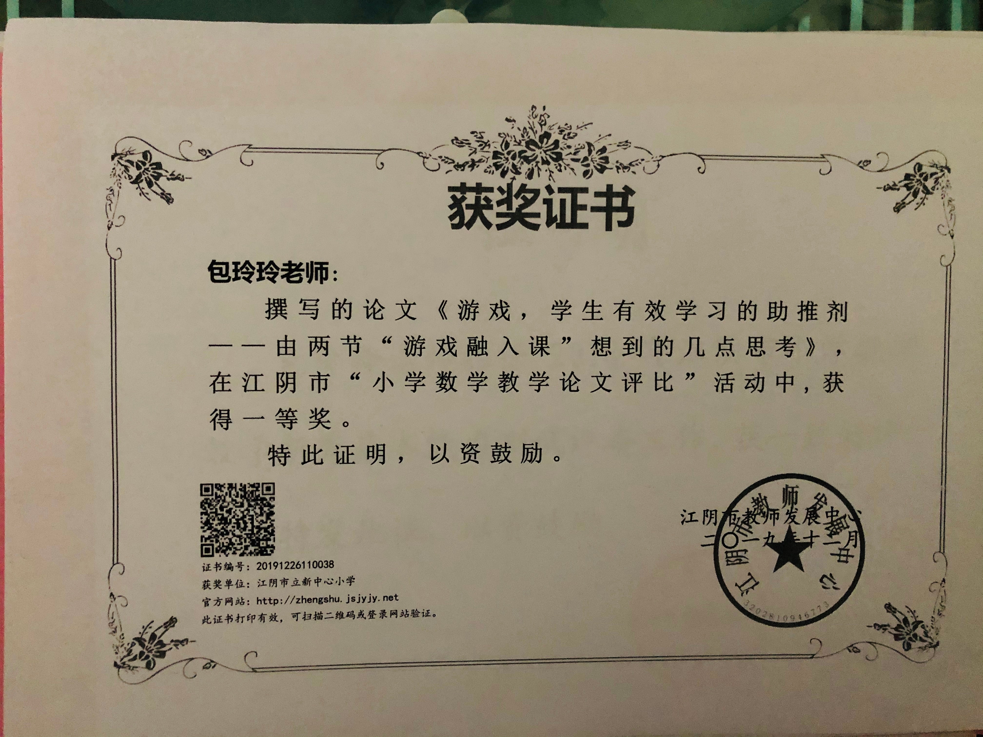 包静娟名师工作室成员包玲玲老师获得江阴市“小学数学教学论文”评比一等奖