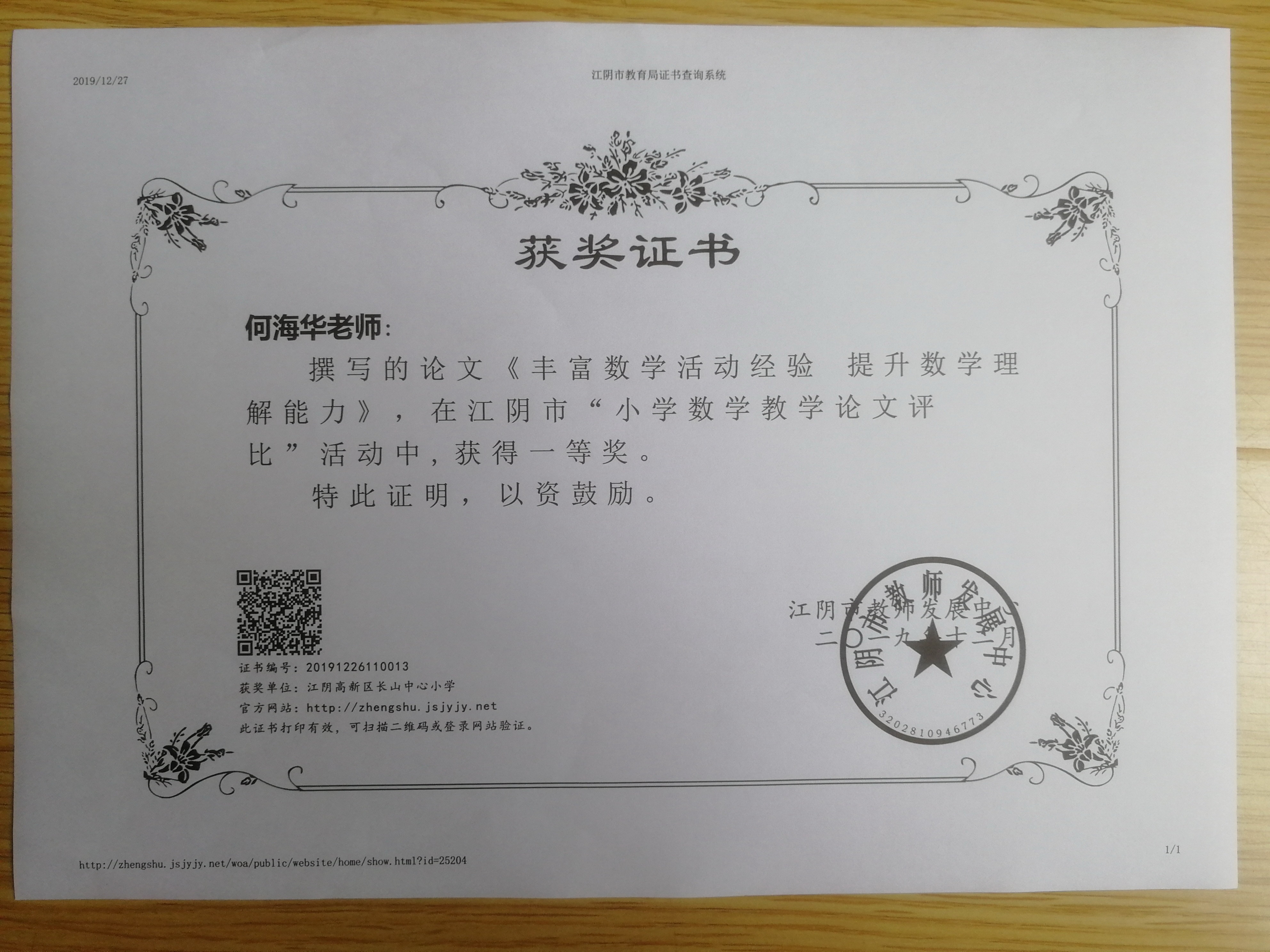 包静娟名师工作室成员何海华老师的论文在江阴市小学数学教学论文评比中获得一等奖