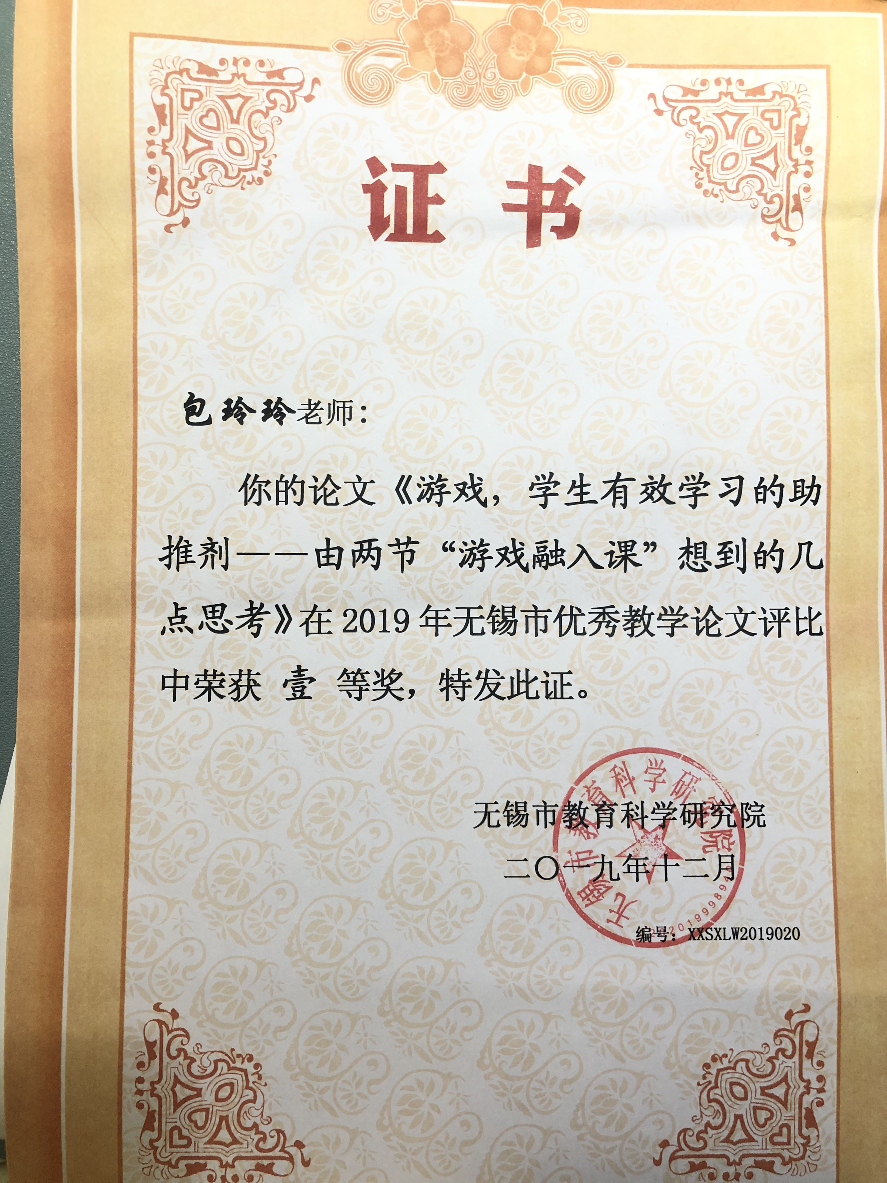 包静娟数学理解名师工作室成员包玲玲老师在无锡市优秀教学论文评比中获得一等奖