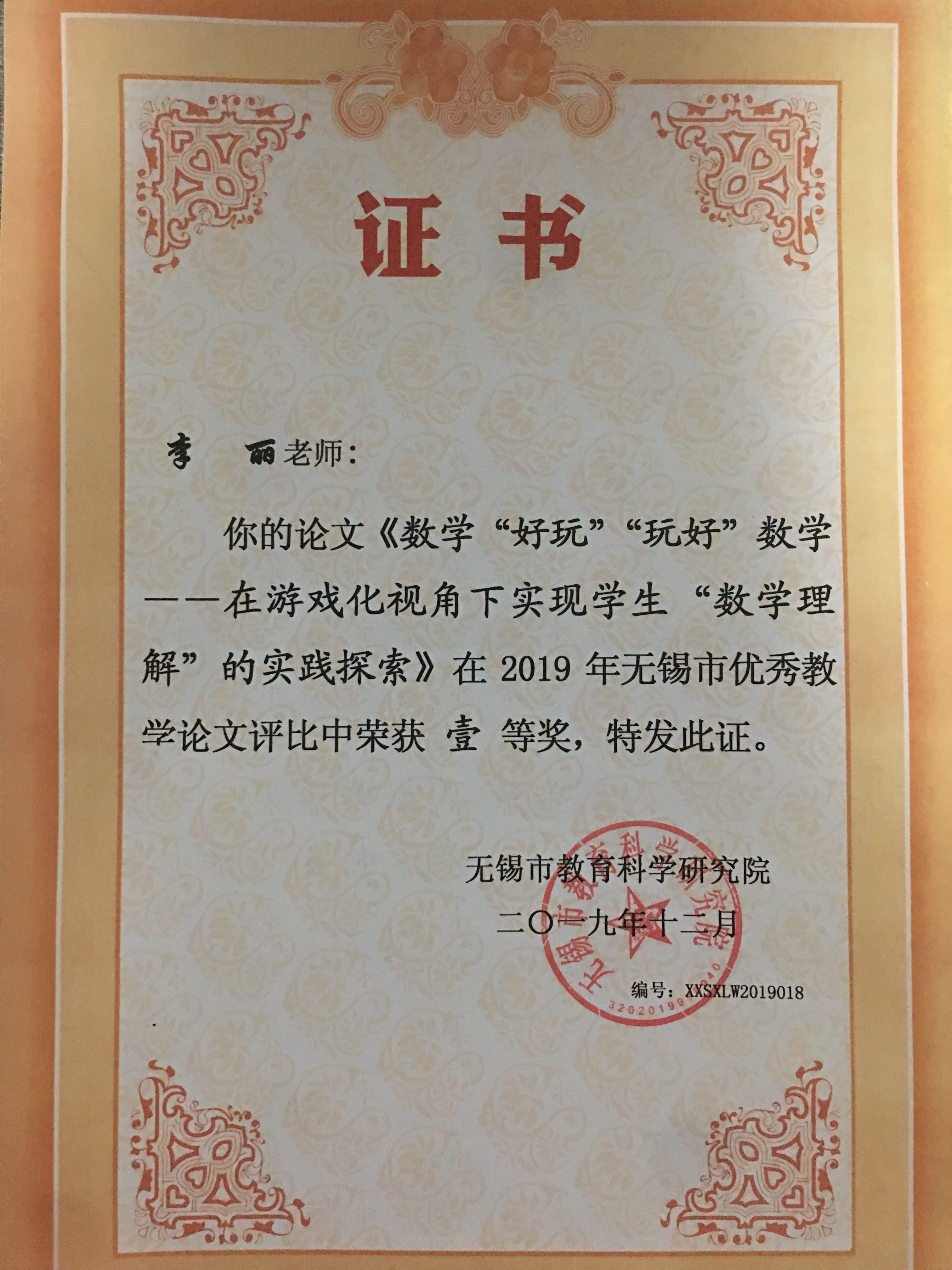 包静娟数学理解工作室成员李丽老师在无锡市优秀教学论文评比中获得一等奖