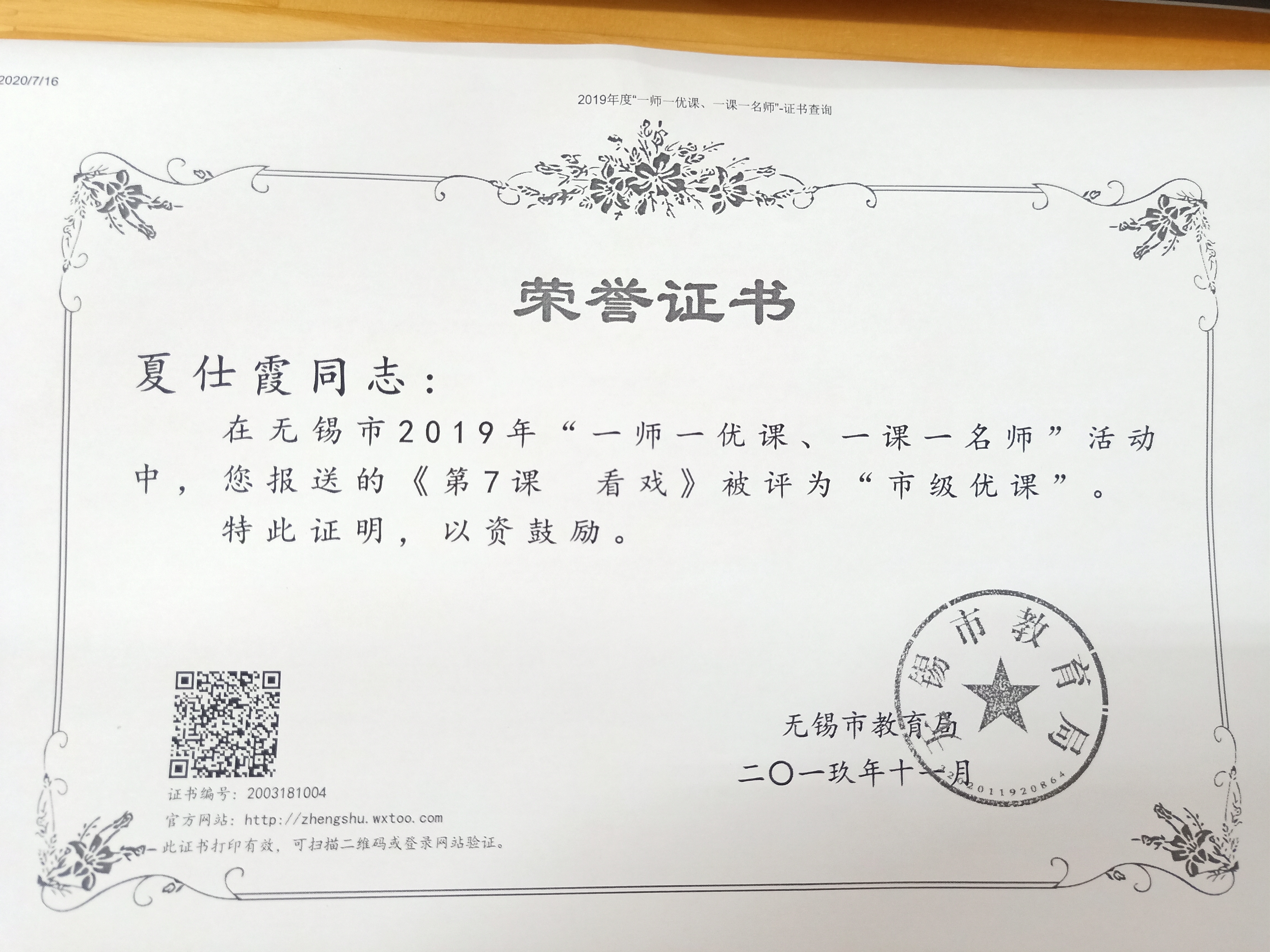 夏仕霞《看戏》获得无锡“一师一优课”优课
