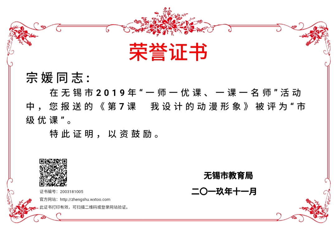 宗媛《我设计的动漫形象》获得无锡“一师一优课”优课