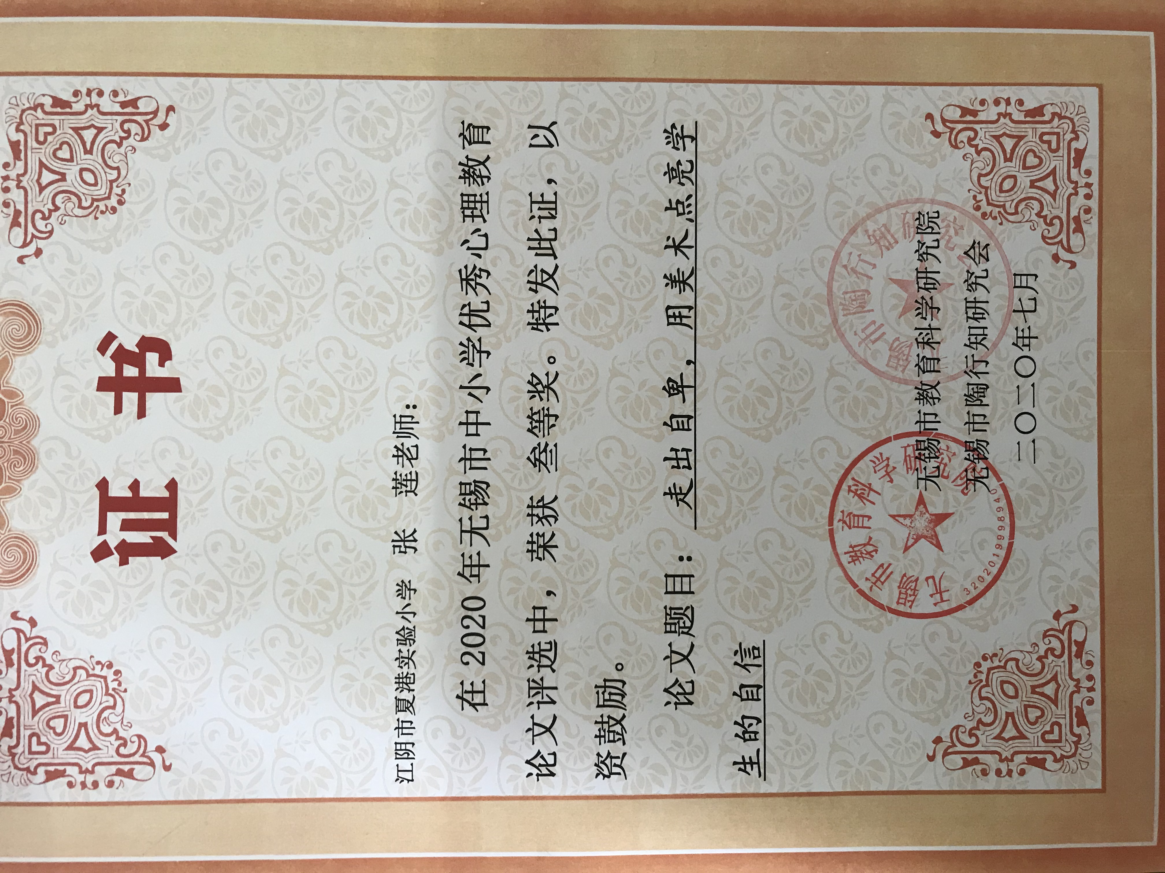 张莲 论文《走出自卑 用美术点亮学生的自信》荣获无锡市中小学优秀心理教育三等奖