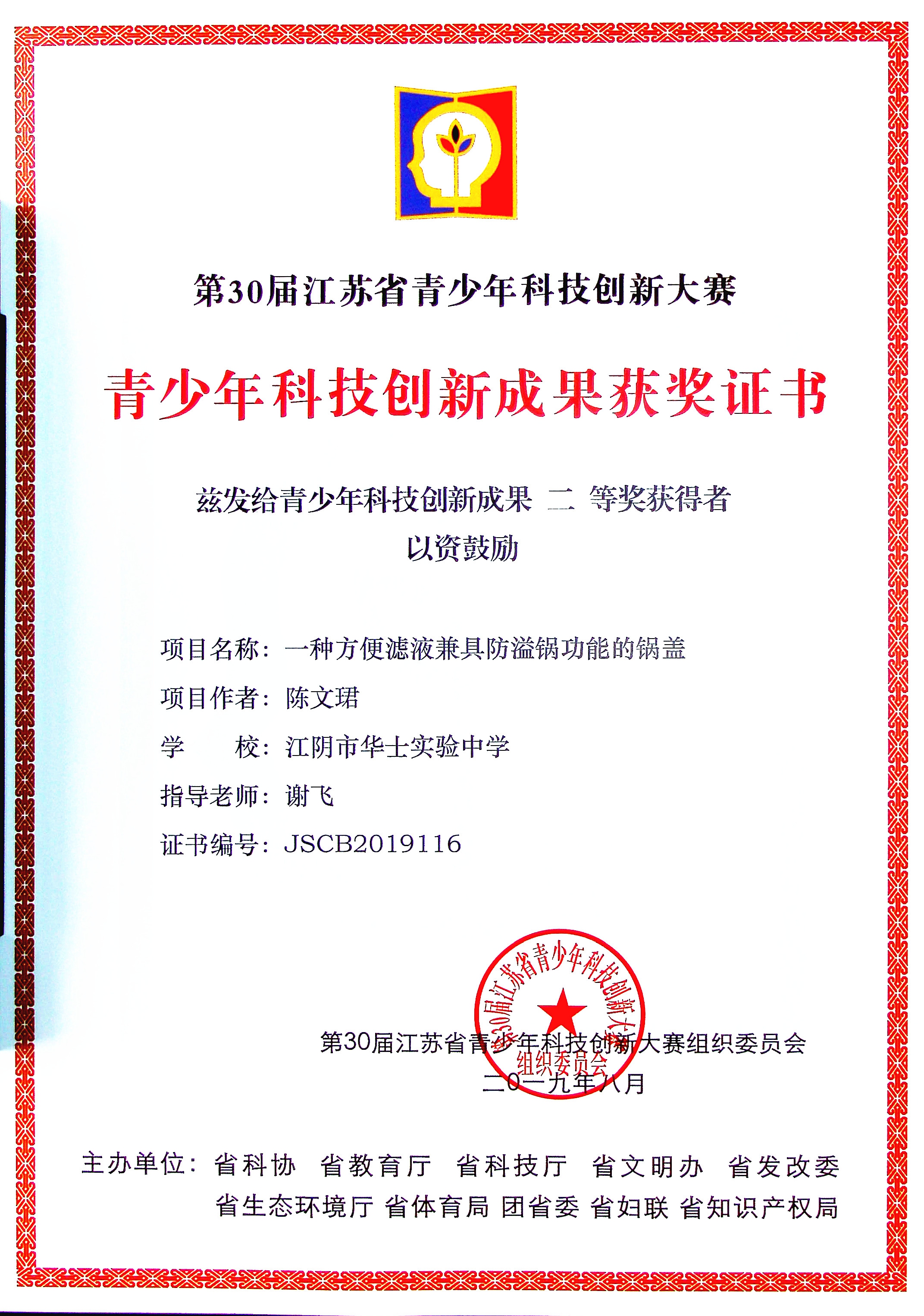 谢飞老师指导学生荣获江苏省青少年科技创新大赛二等奖