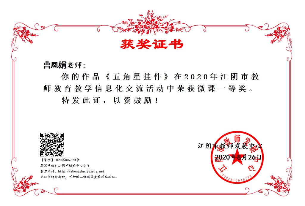 曹凤娟荣获江阴市教师教育教学信息化交流活动一等奖