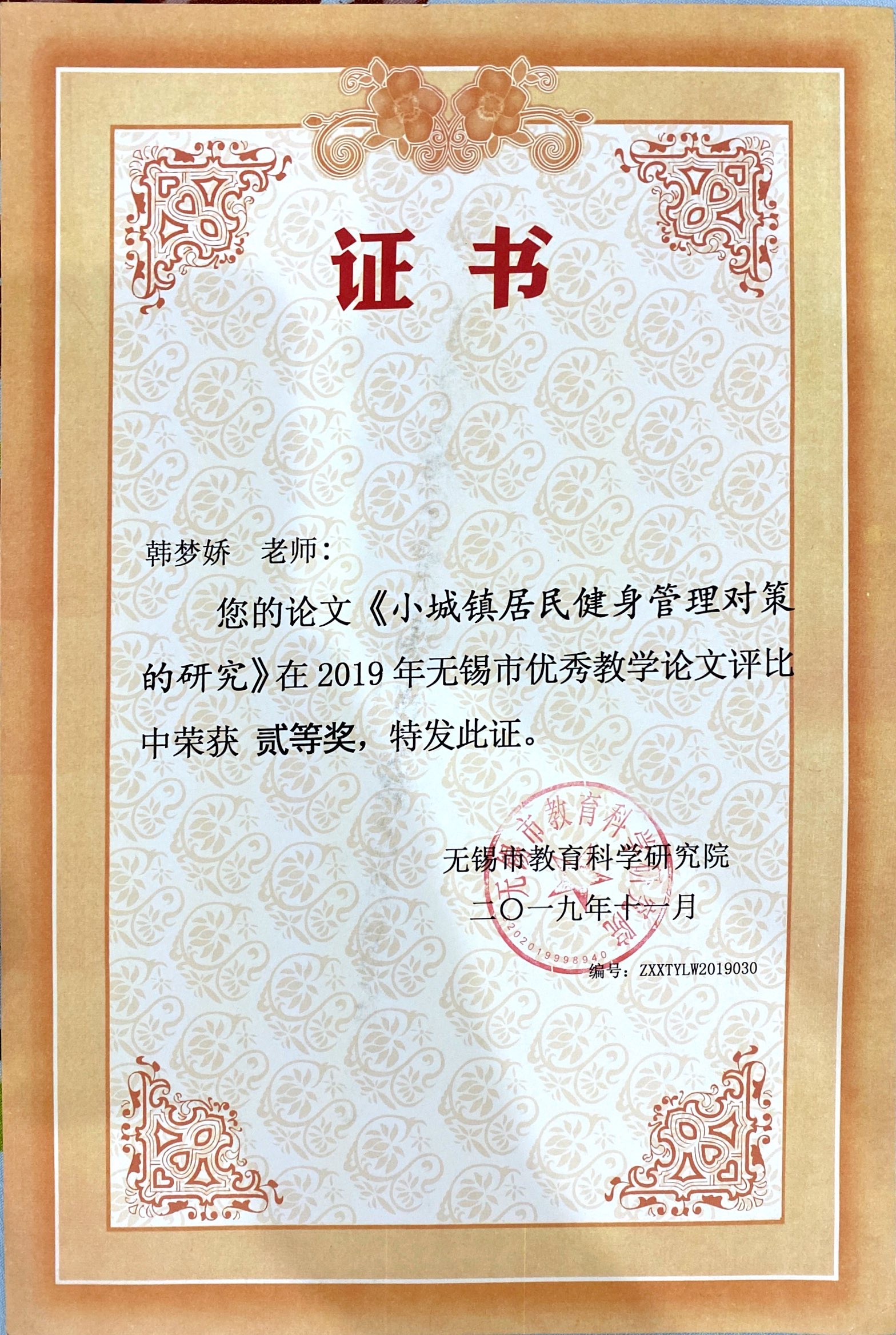 韩梦娇老师在2019年无锡市优秀教学论文评比中荣获贰等奖