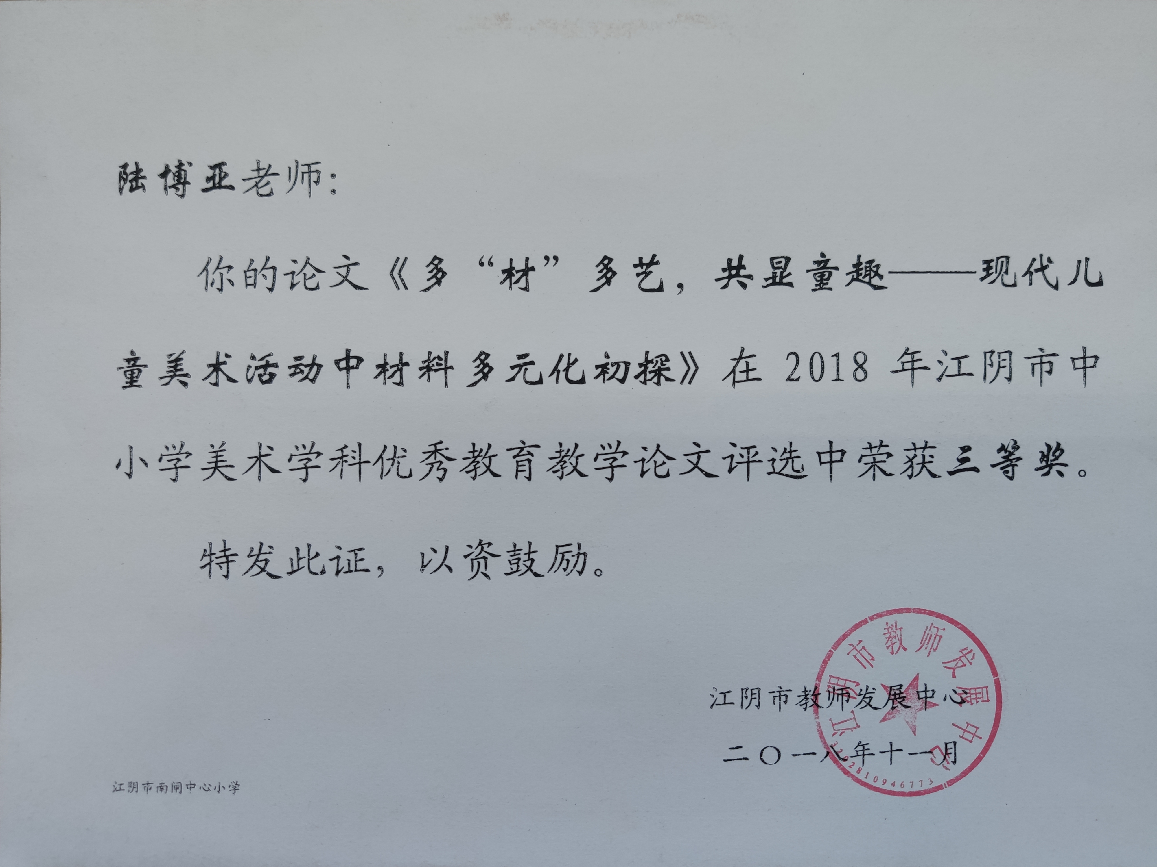 成员陆博亚在2019年度江阴市小学美术“三力”课堂教学大比武中,获三等奖