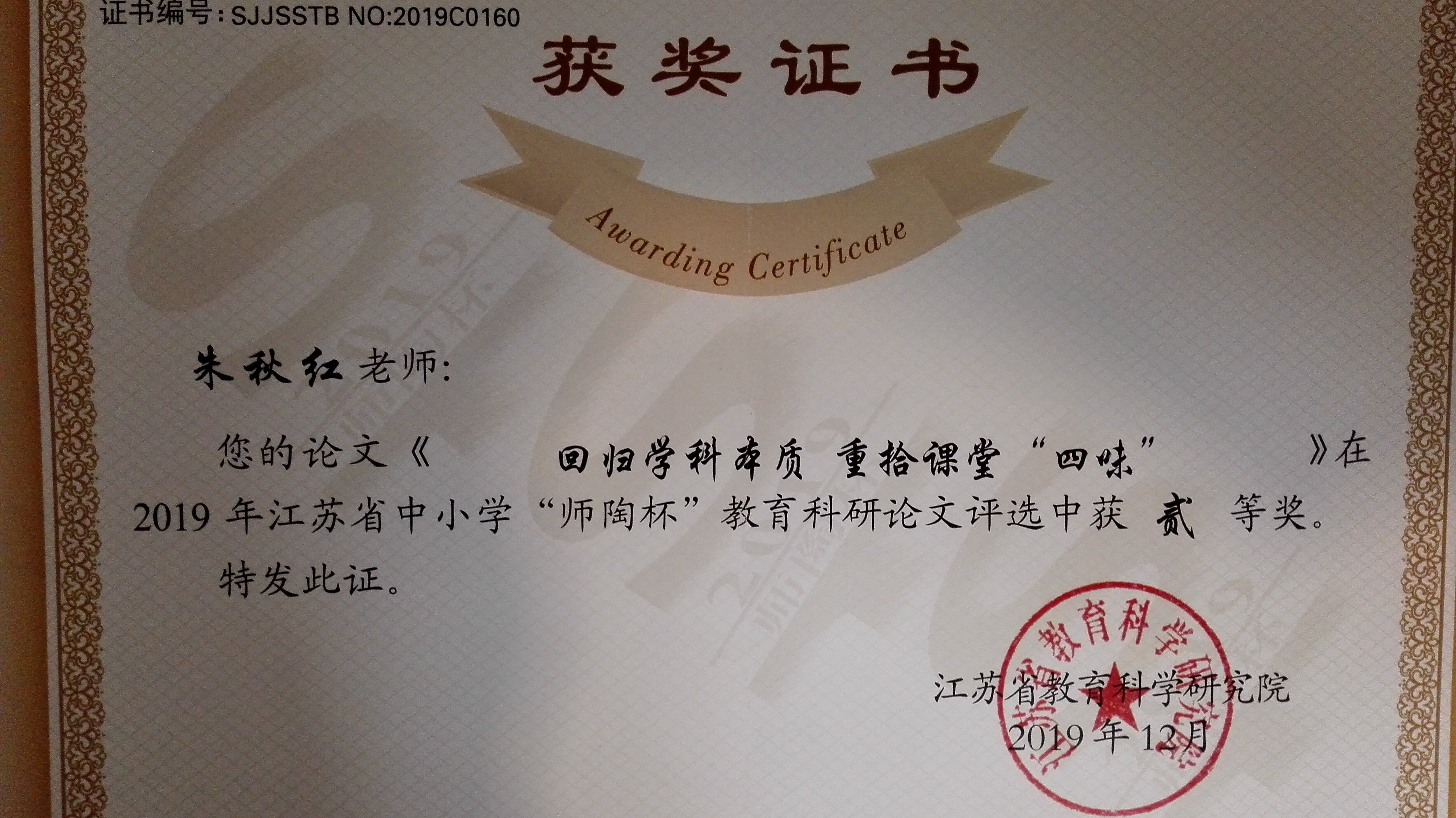 朱秋红获江苏省师陶杯论文二等奖