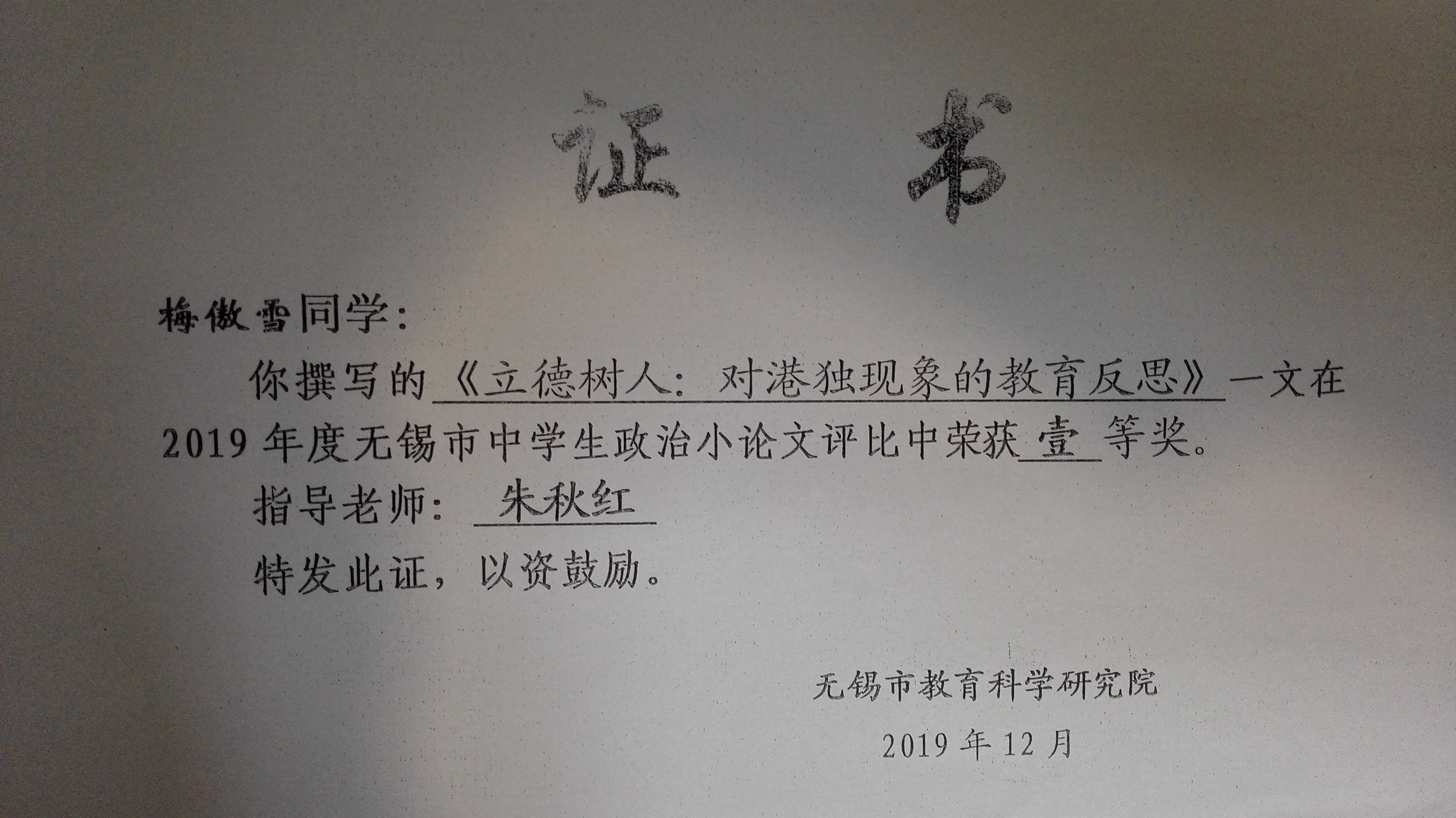 朱秋红指导学生小论文获奖