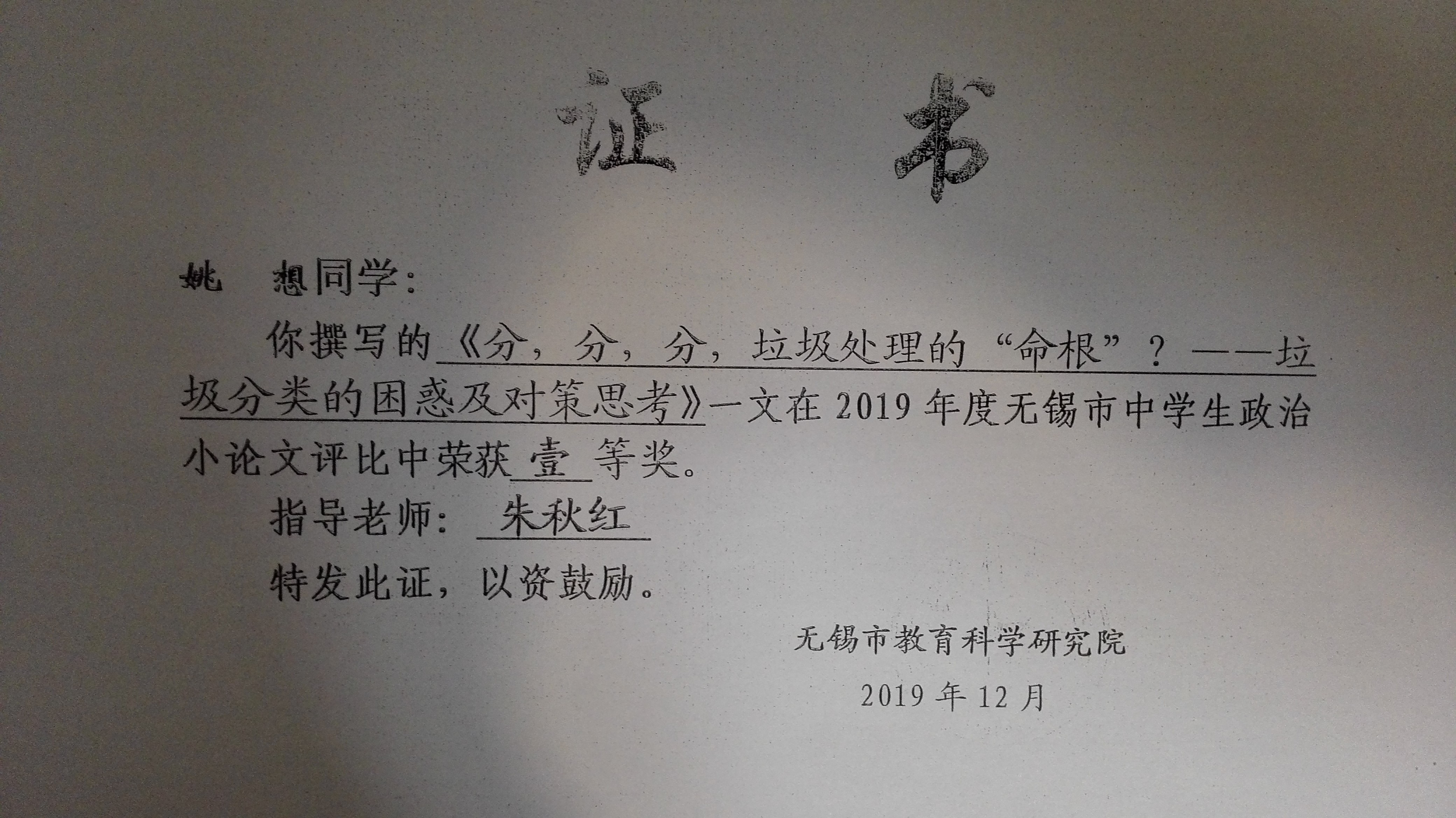 朱秋红指导学生小论文获奖