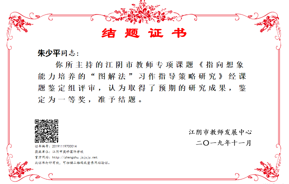 朱少平 教师个人专项课题《指向想象能力培养的“图解法”习作指导策略研究》一等奖