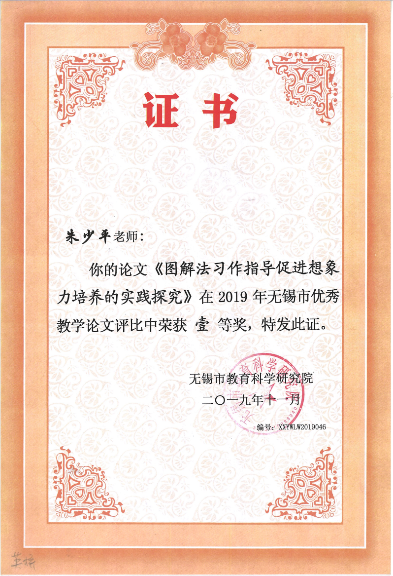 朱少平 论文《图解法习作指导促进想象力培养的实践探究》一等奖