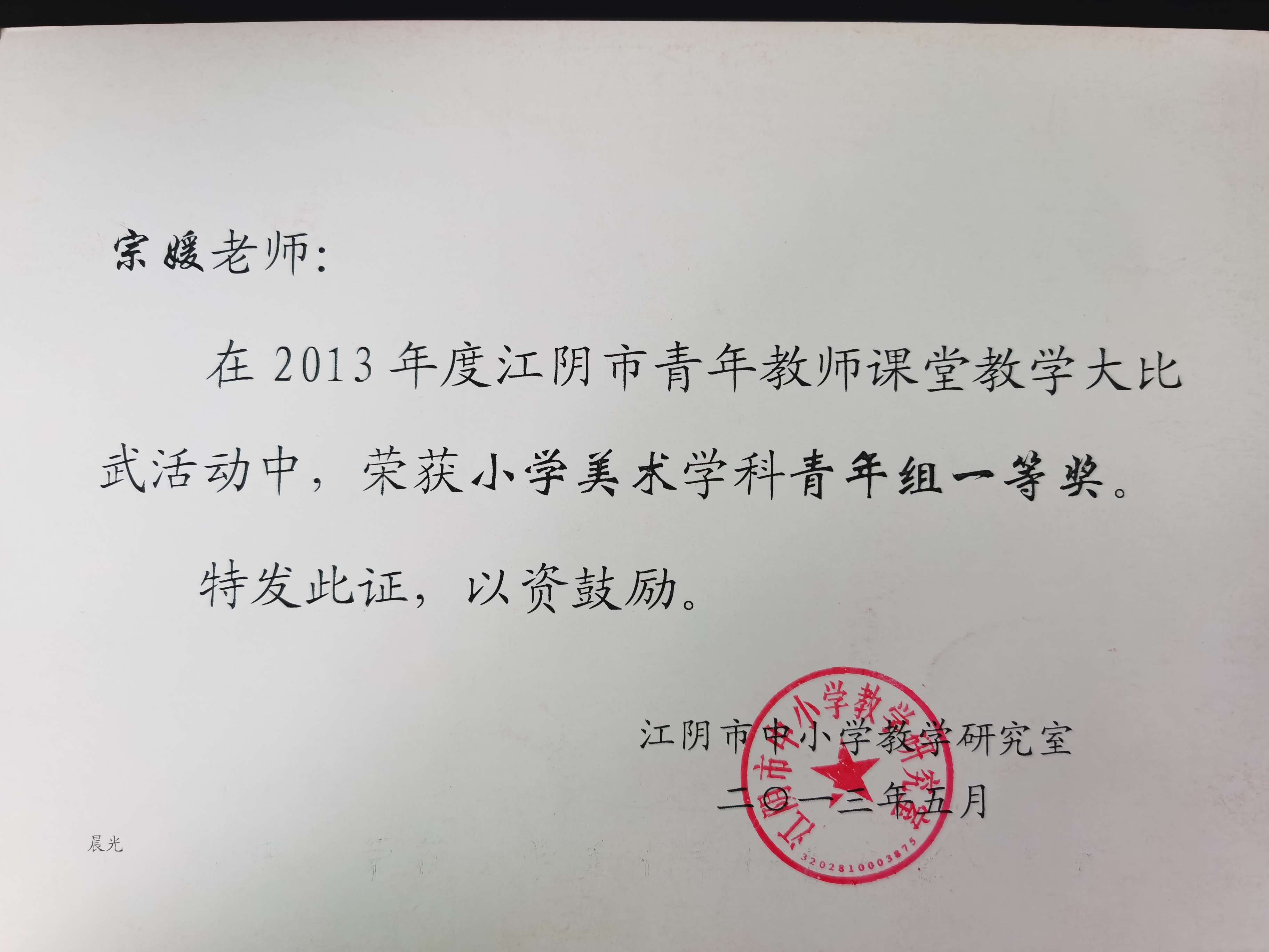 胡艳华名师工作室成员宗媛获2013江阴市青年教师大比武一等奖
