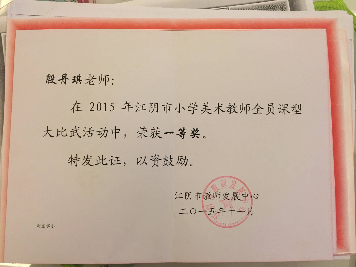 成员殷丹琪在2015年在江阴市中小学美术教师全员课型大比武活动中,荣获一等奖
