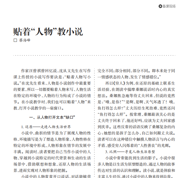 学员蔡海峰论文《贴着人物教小说》发表于《小学语文教师》2019年第12期