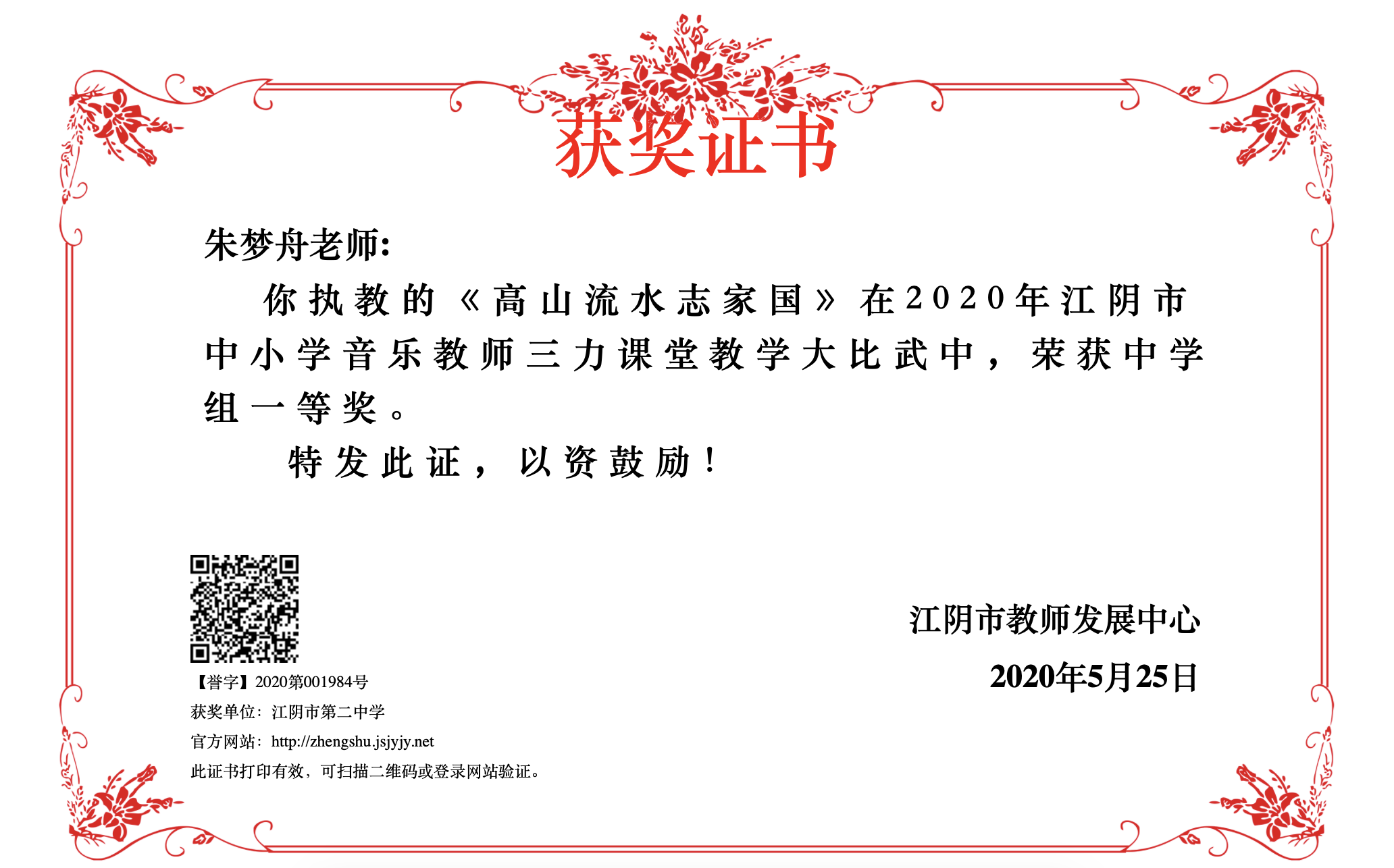 朱梦舟老师在2020年江阴市中小学音乐教师三力课堂教学大比武中获中学组一等奖 2020-10-13