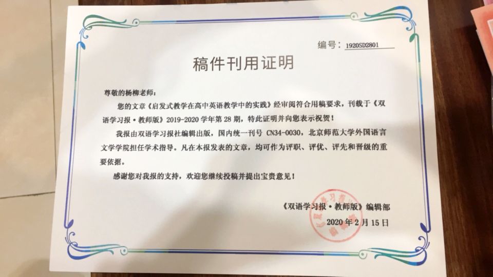 《启发式教学在高中英语教学中的实践》发表于《双语学习报 教师版》2019-2020年第28期。