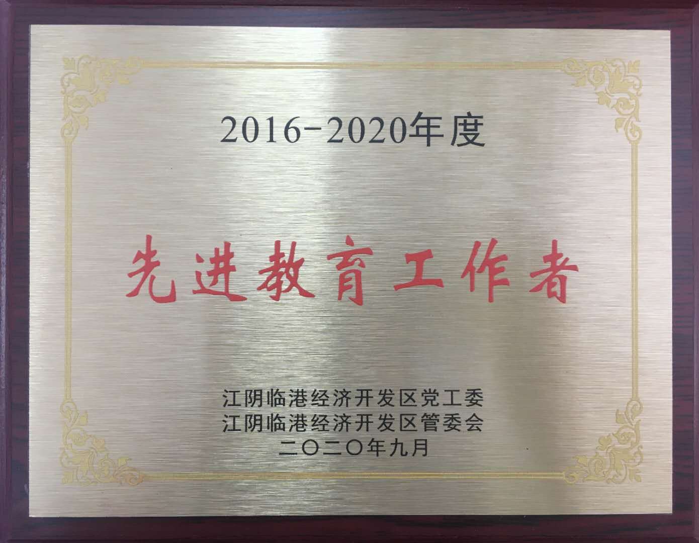 李洁老师获江阴市2016-2020年度“先进教育工作者”称号