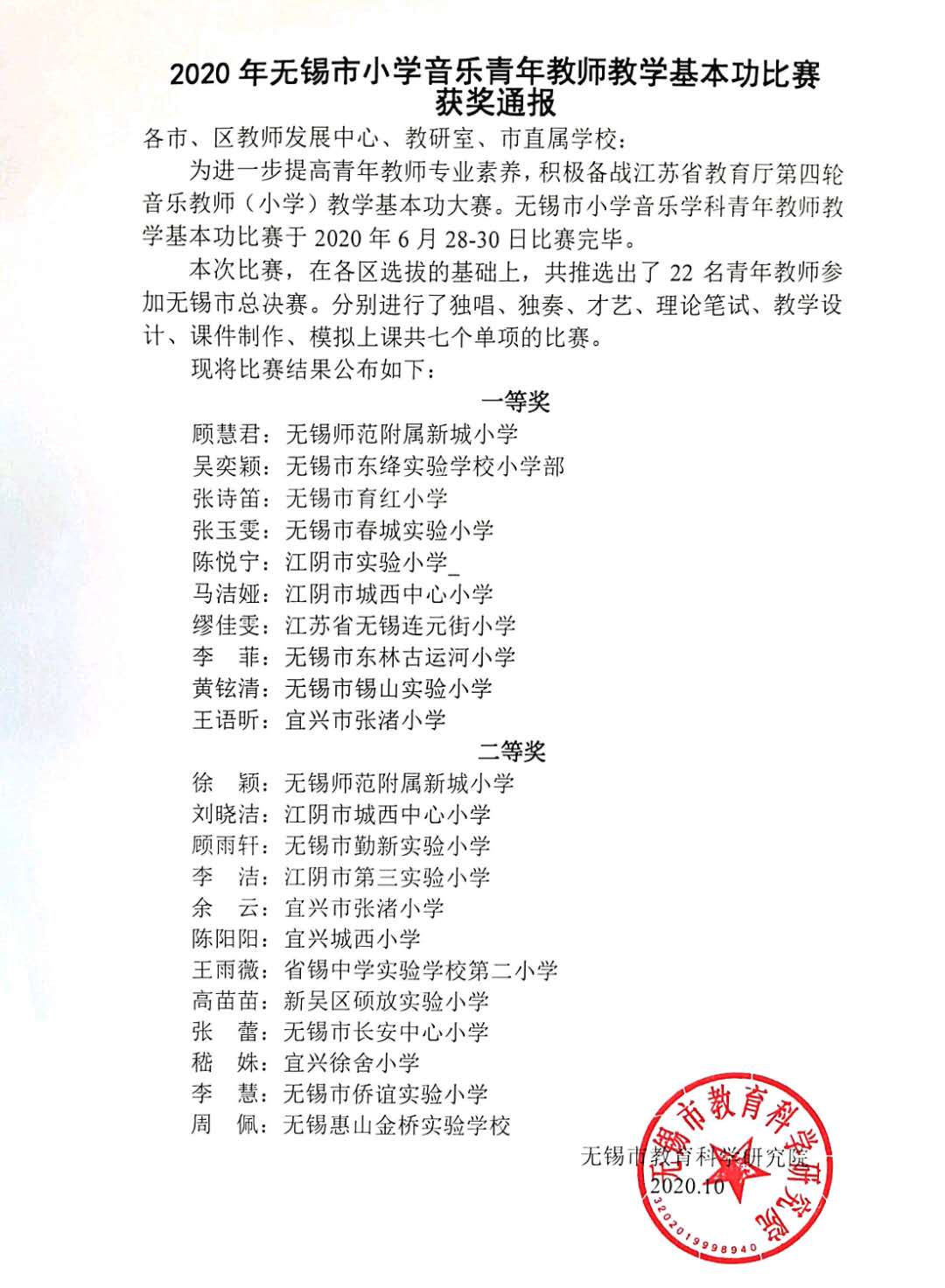 李洁老师获2020年无锡市基础教育青年教师教学基本功大赛二等奖 2020-10-18
