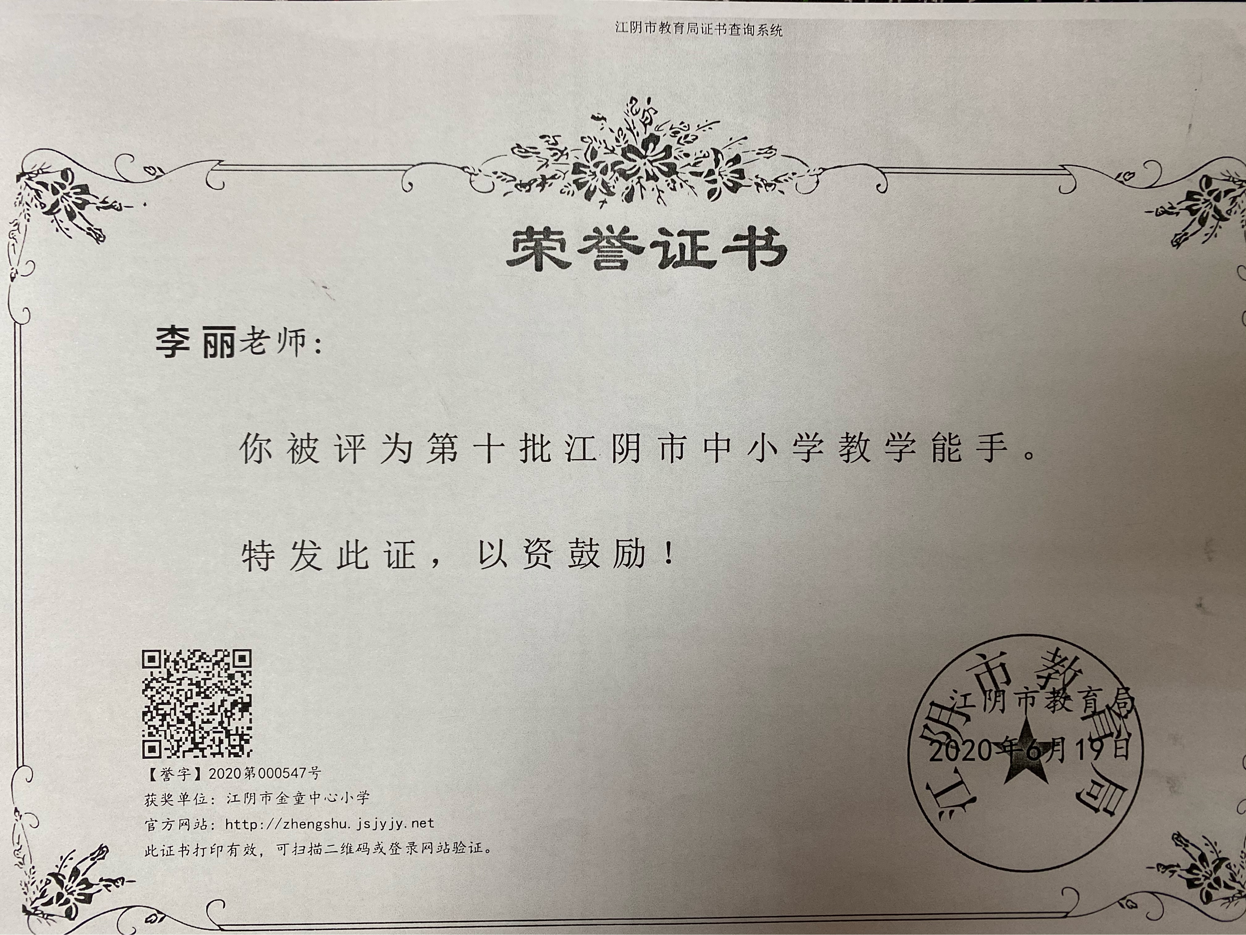 李丽老师被评为江阴市第十批中小学教学能手
