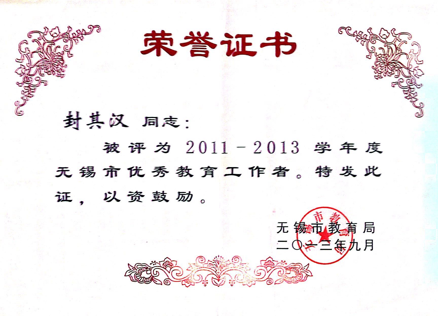 封其汉获得无锡市先进教育工作者称号