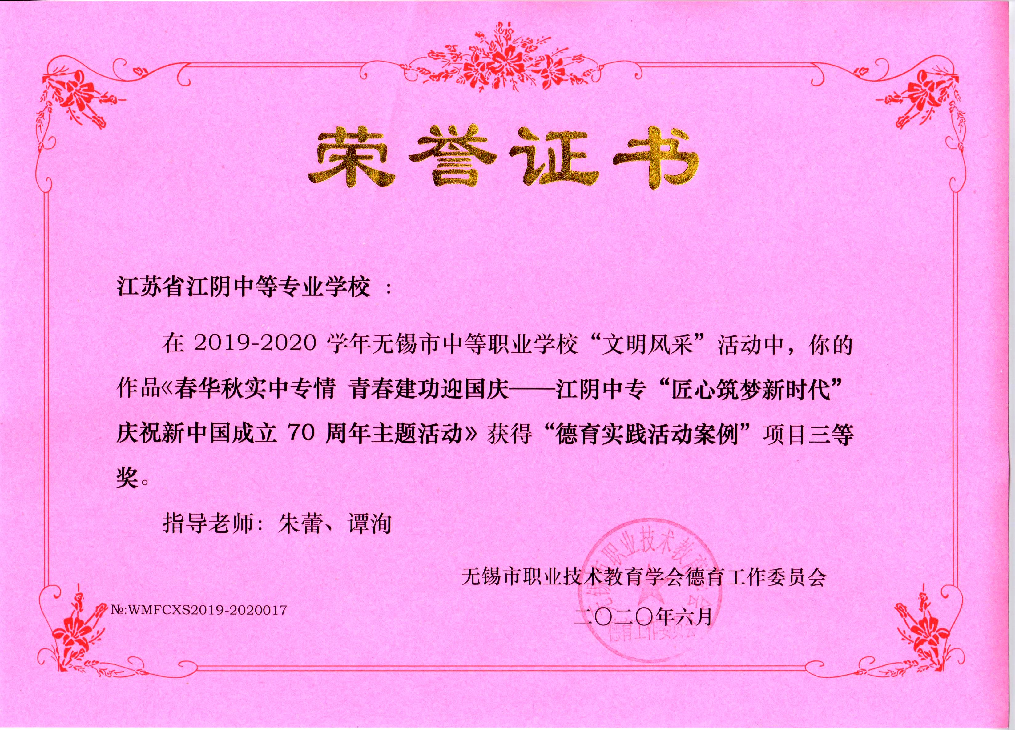 2020.6 朱蕾老师在无锡市文明风采活动中荣获“德育实践活动案例”三等奖