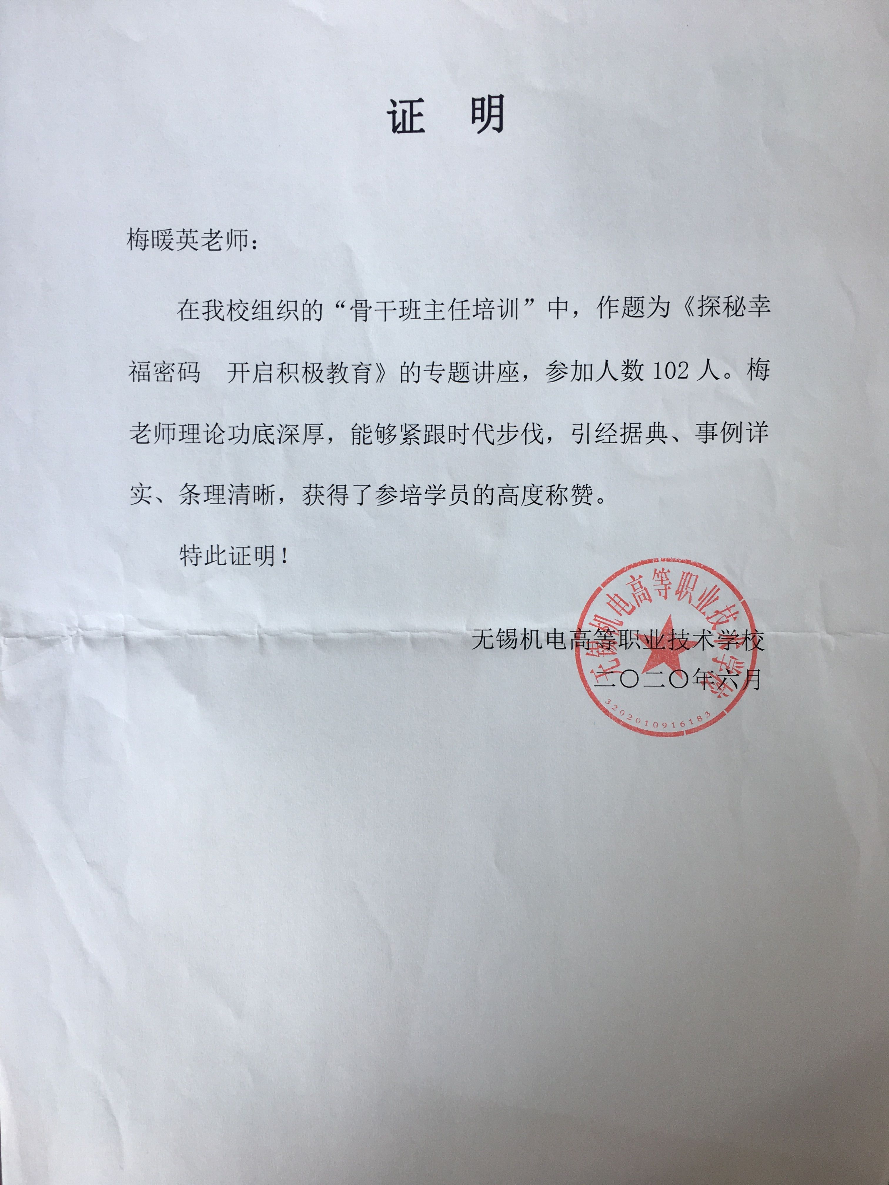 市级讲座1:梅暖英为无锡机电高等职业技术学校骨干班主任做专题讲座