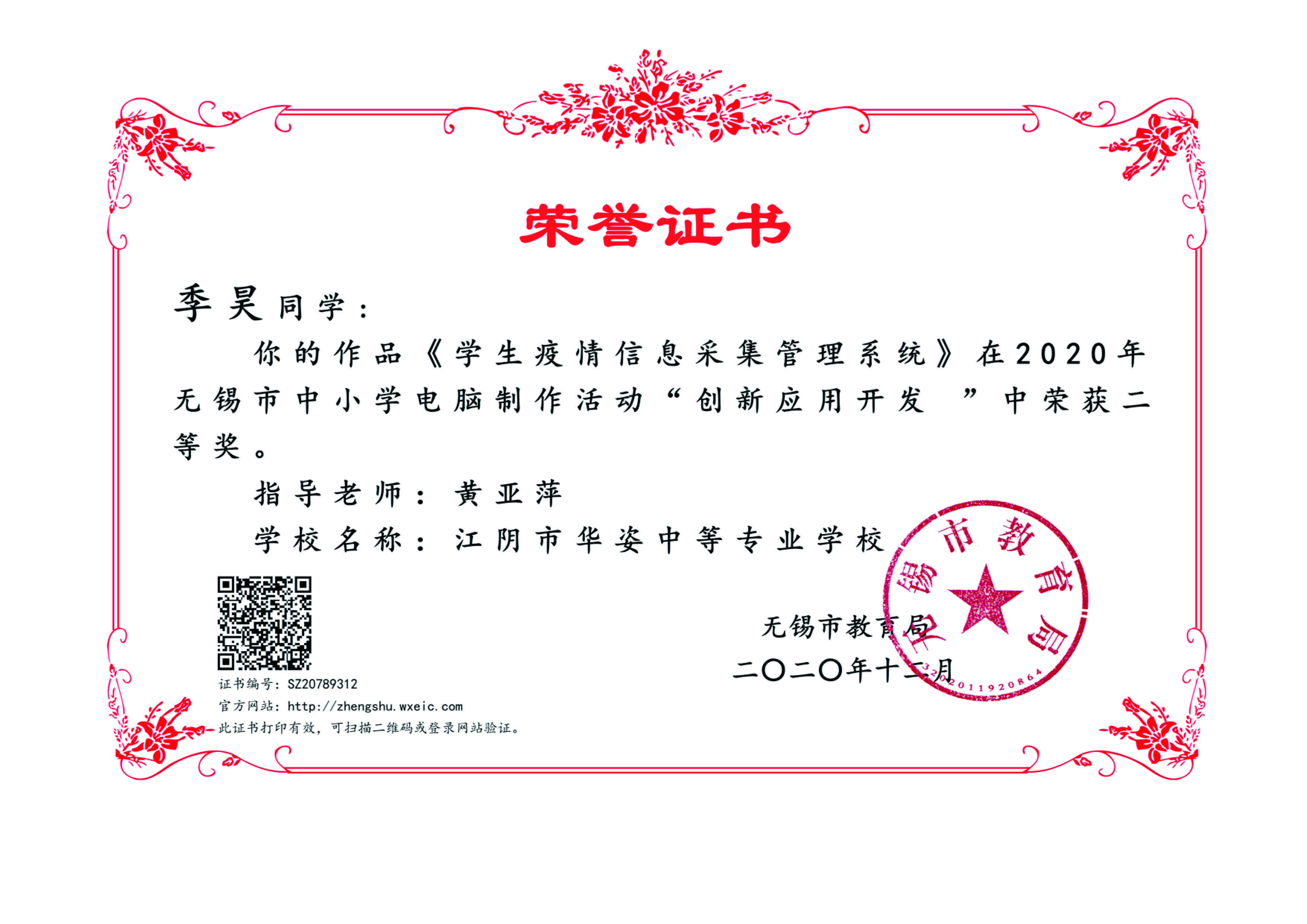 2020年无锡市中小学电脑制作活动中,邱婷和黄亚萍老师指导的学生分获创意程序设计组一等奖和二等奖,邱婷老师获得“优秀辅导员”称号。