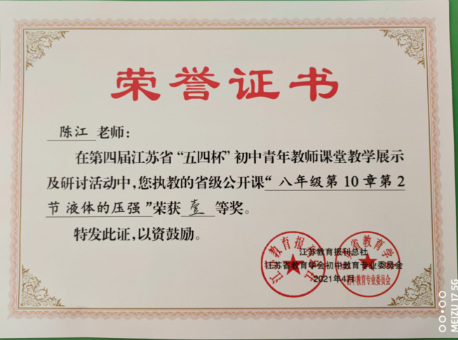 工作室学员陈江老师获江苏省五四杯教学比赛一等奖