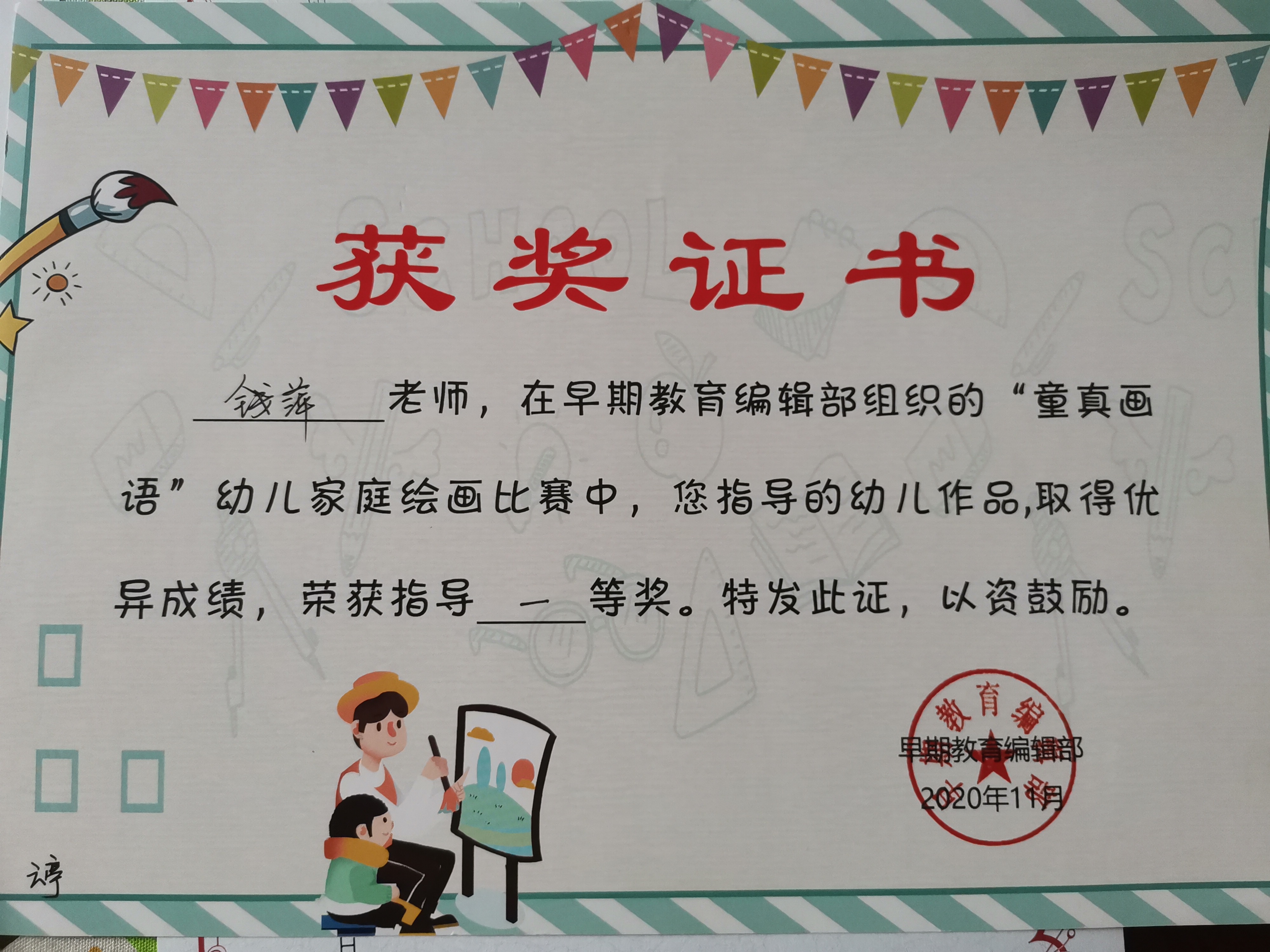 钱萍老师在“童真画语”幼儿家庭绘画比赛中荣获指导一等奖