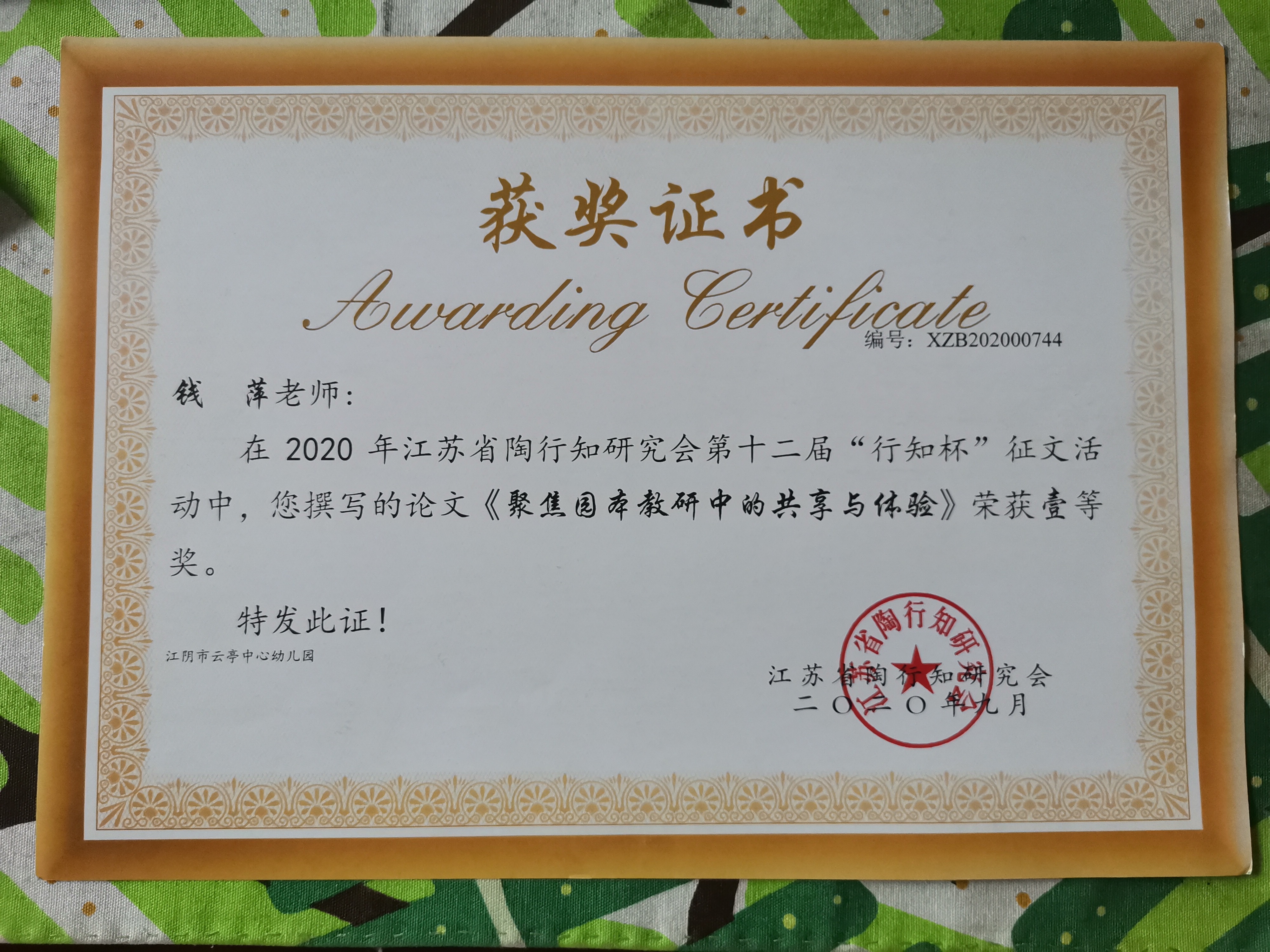 钱萍老师论文《聚焦园本教研中的共享与体验》江苏省陶研会一等奖