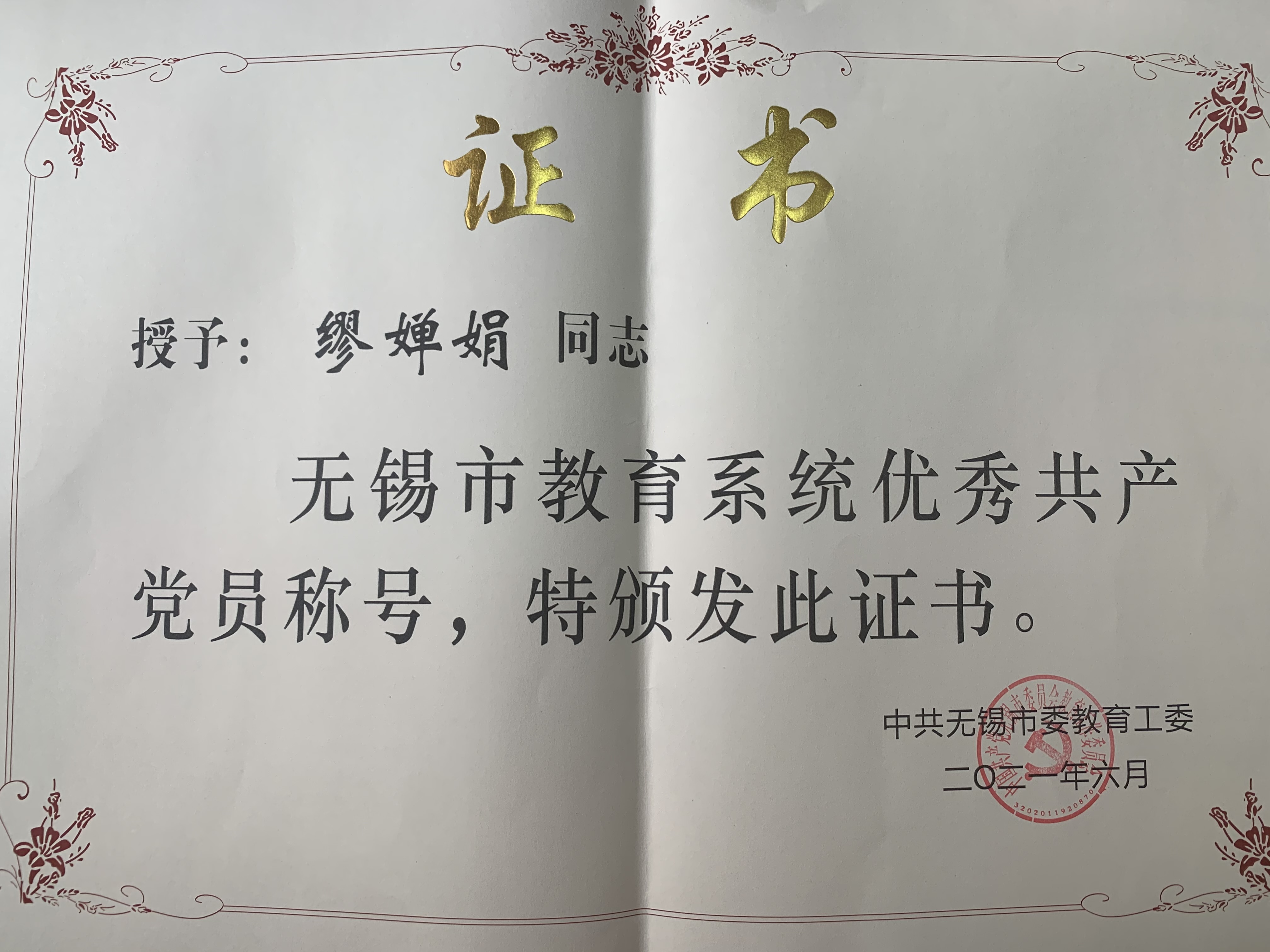 缪婵娟老师被评为无锡市教育系统优秀共产党员