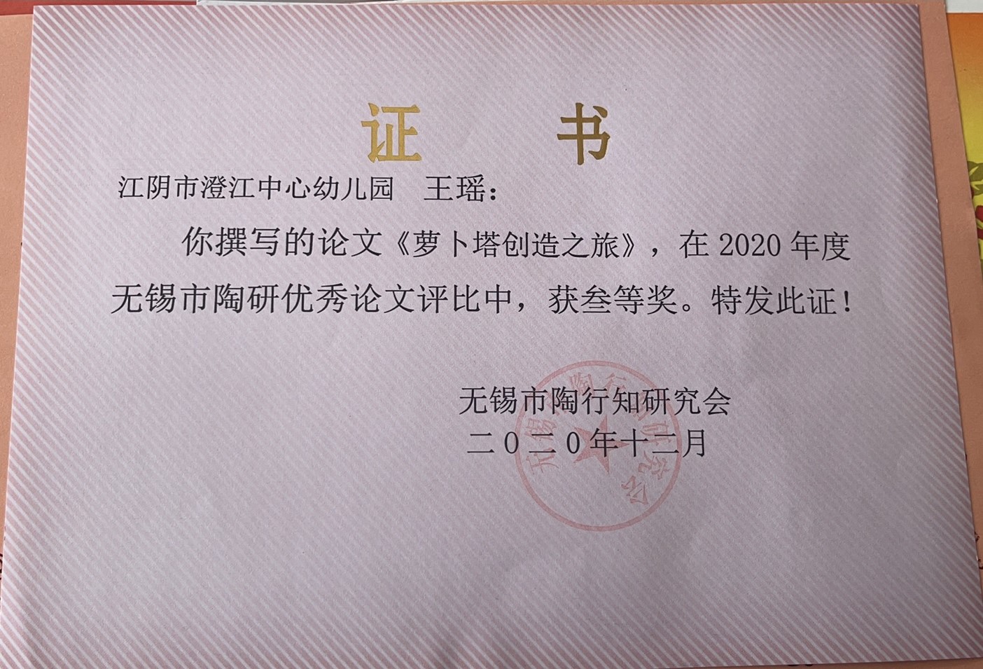 王瑶老师的论文获无锡市陶研会论文三等奖
