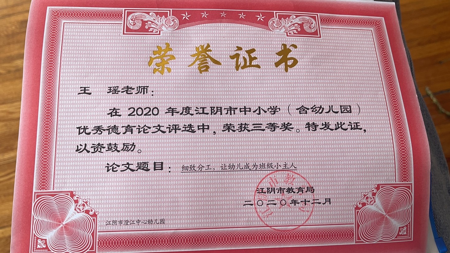王瑶老师的论文获江阴市中小学德育论文论文三等奖