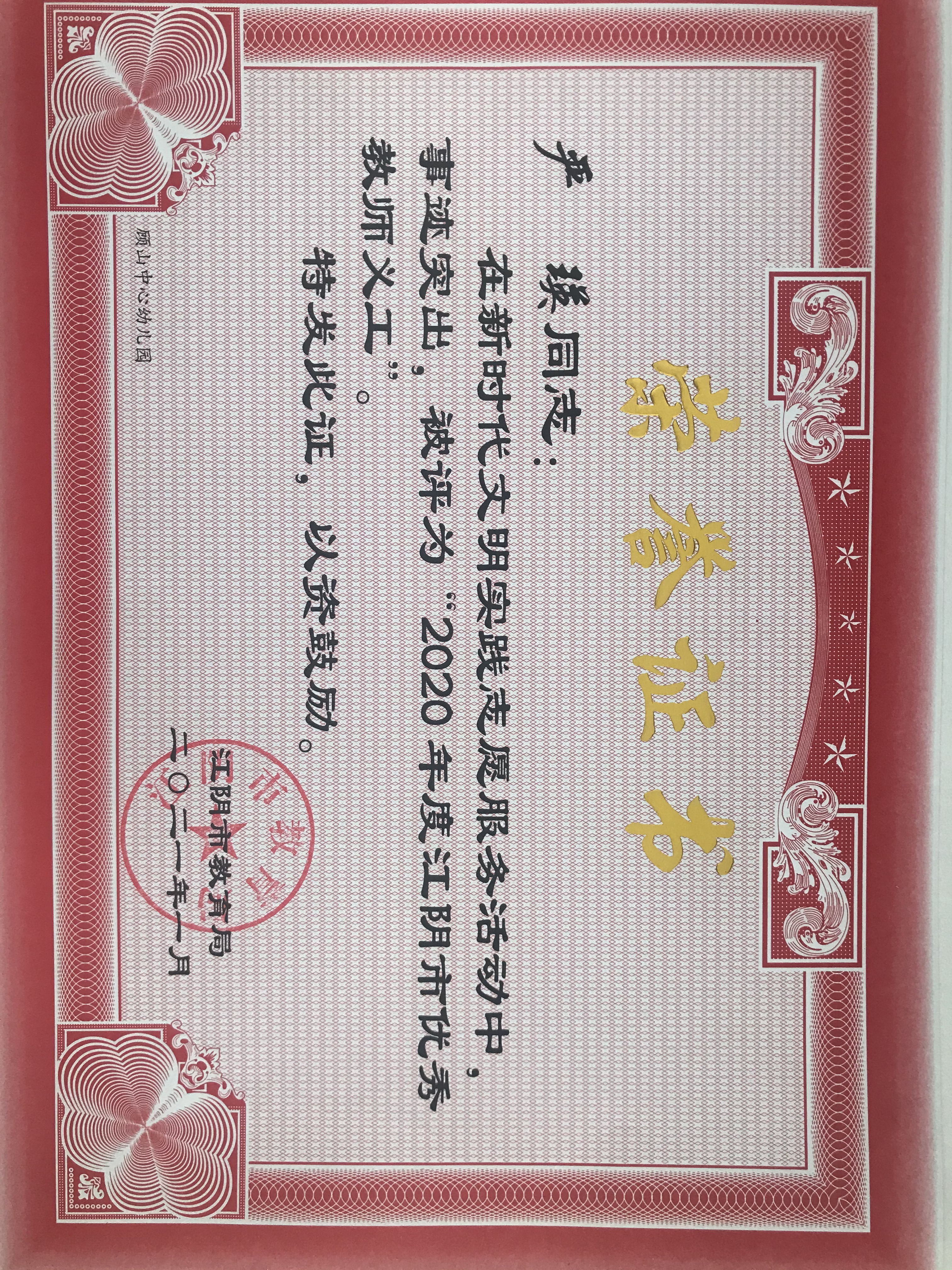 严瑛老师被评为2020年度江阴市优秀教师义工